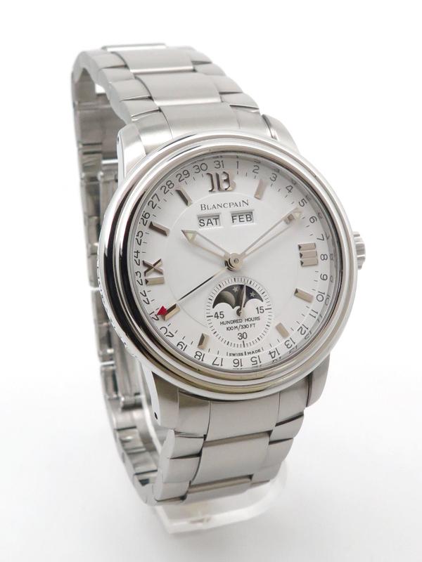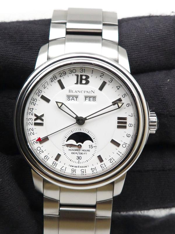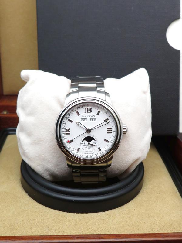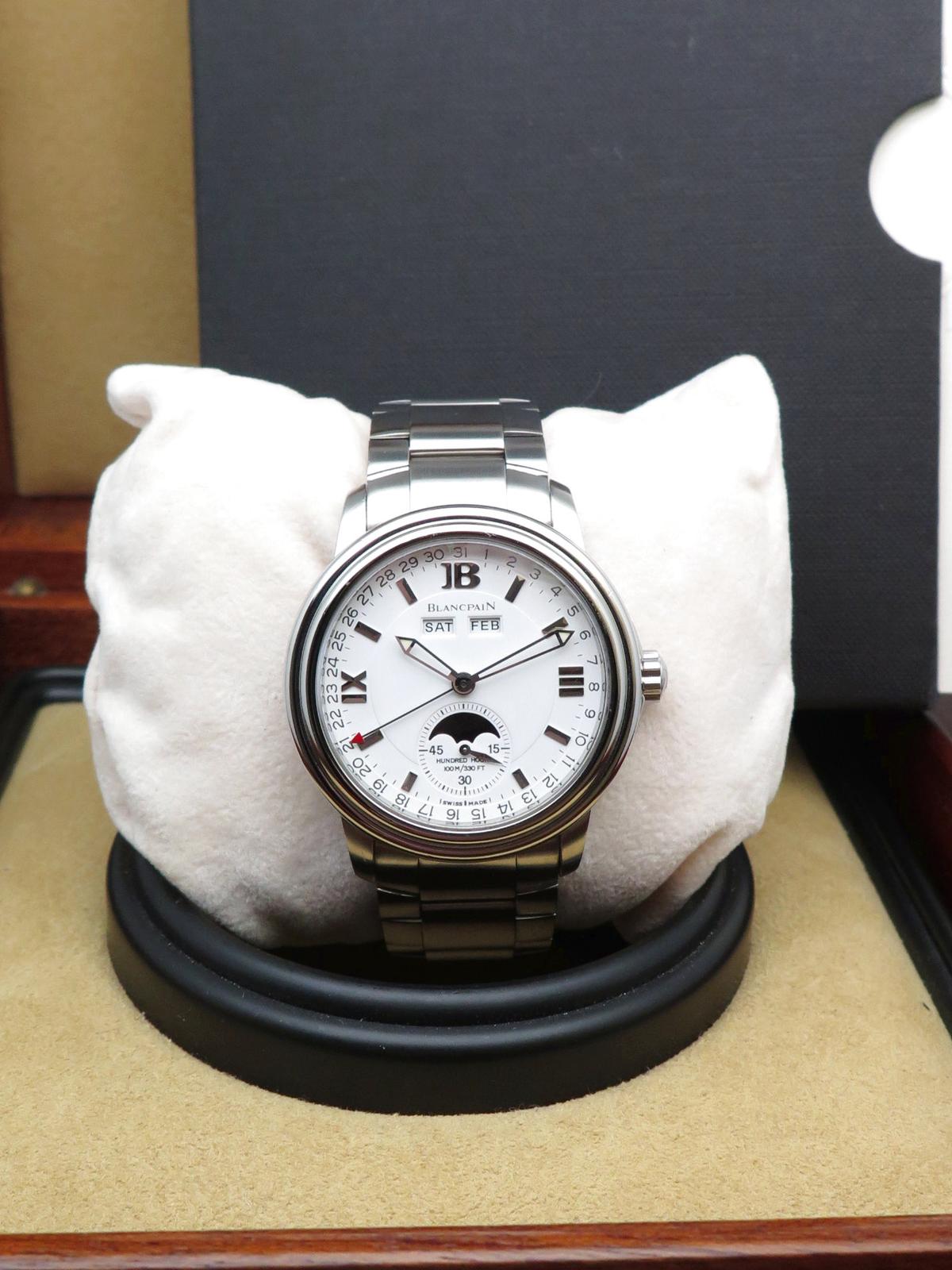 Rare Léman Moonphase Complete Calendar Full set - Ref 2763-1127 Steel case on steel bracelet with Blancpain double deployant, white dial, stick indexes and Roman numerals, moon phase, day, month, date, small seconds, screw-down crown, sapphire crystal, automatic movement caliber 6763 100 h power reserve. Delivered with original Blancpain box and papers, the truly beautiful Blancpains with a timeless size, unbeatable complications price ratio !!