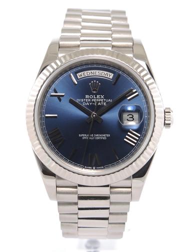 New Rolex Day-Date 40 228239 with Rolex Service Paper Complet or blanc, bracelet President, cadran bleu soleillé, indexes chiffres romains appliqués, jour & date, lunette cannelée, verre saphir, mouvement automatique certifié chronomètre (COSC). Avec service Rolex. 32 500 € Bruxelles