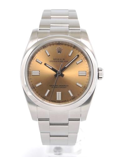 New Rolex Oyster Perpetual 36 116000 Full Set Complet acier, bracelet Oyster, cadran bronze soleillé, indexes bâtons appliqués, date, verre saphir, lunette lisse, couronne vissée, mouvement automatique certifié chronomètre (COSC). Avec boîte et papiers d'origine, set complet ! 6 250 € Bruxelles