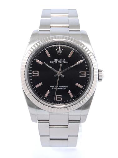 New Rolex Oyster Perpetual 36 116034 Full steel, Oyster bracelet, black dial with pink markers, white gold fluted bezel, sapphire glass, screw down crown, chronometer certified automatic movement (COSC). 6 450 € Bruxelles