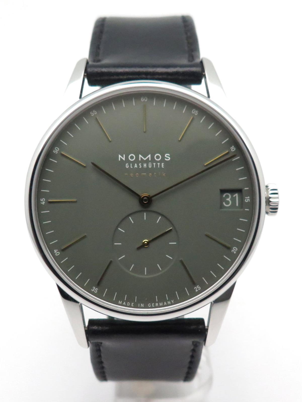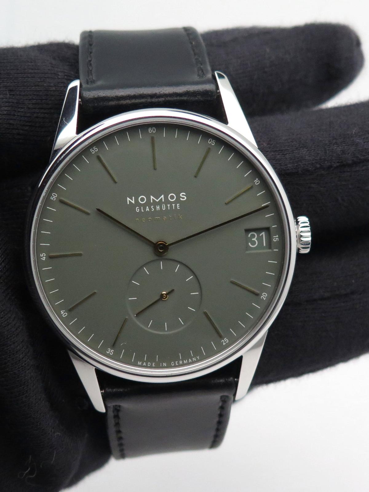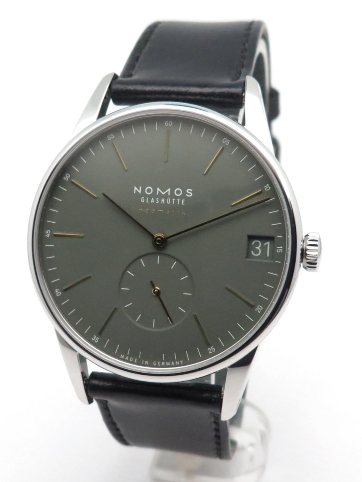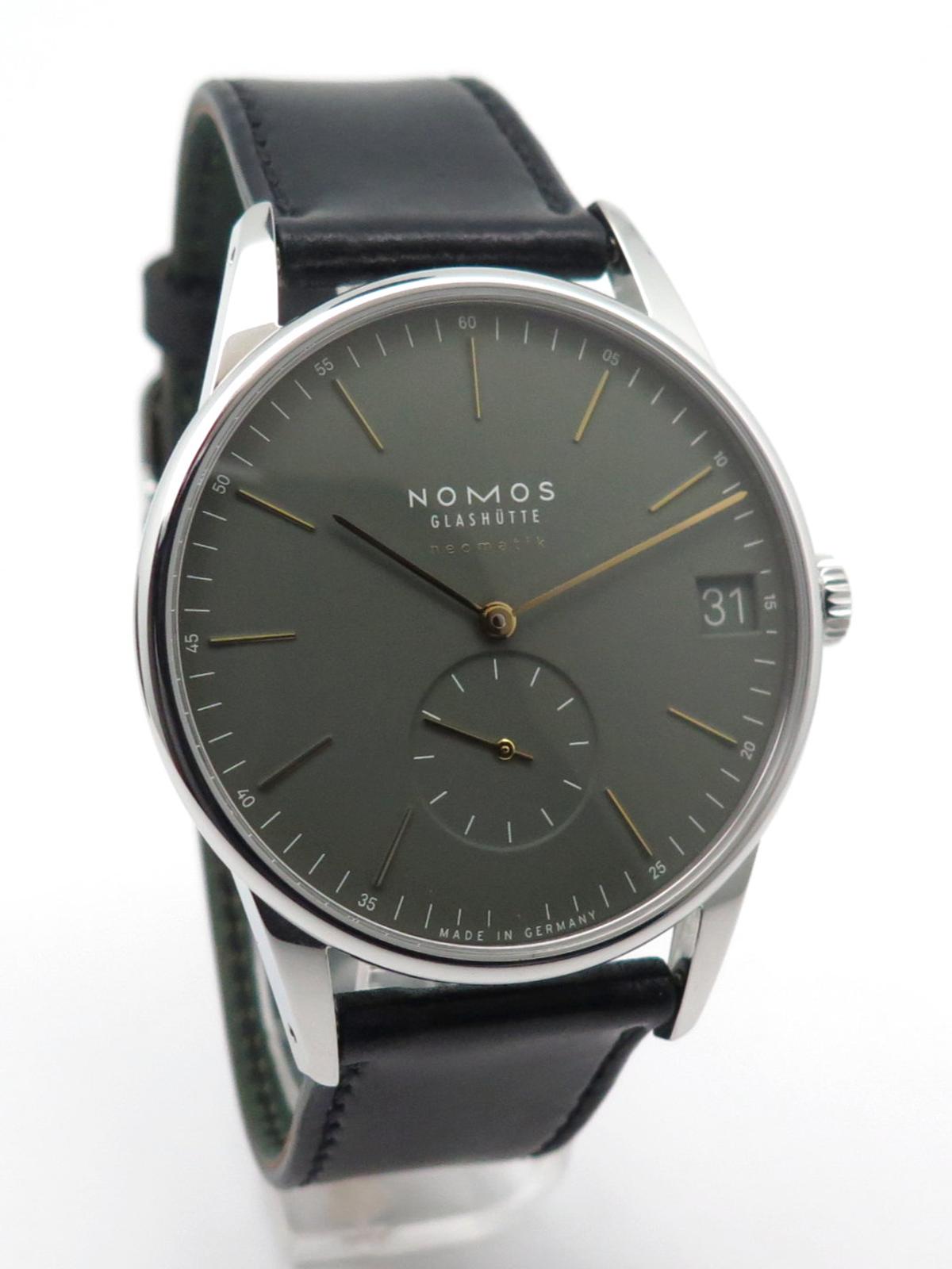 Orion neomatik 41 khaki full set - Ref 364 Steel case on dark green cordavan leather strap, khaki green dial with yellow gold indexes and hands, small seconds at 6 o'clock and date at 3 o'clock, automatic movement caliber DUW6101, sapphire crystal and back, delivered with original Nomos box and papers, new strap in perfect condition!