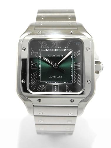 New Cartier Santos Grand Modèle WSSA0062 Full Set 2024 Complet acier, bracelet cuir supplémentaire, cadran vert soleillé, index chiffres romains, aiguilles glaives, date, verre saphir, mouvement automatique. Avec boîte et papiers d'origine, set complet ! 7 450 € Bruxelles