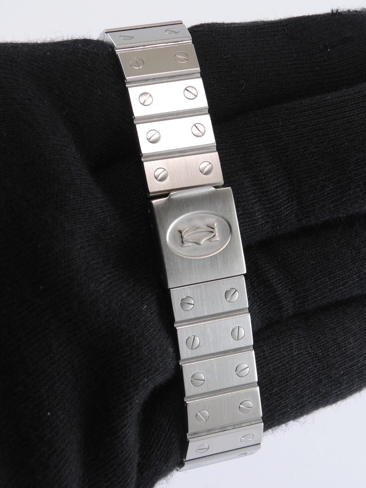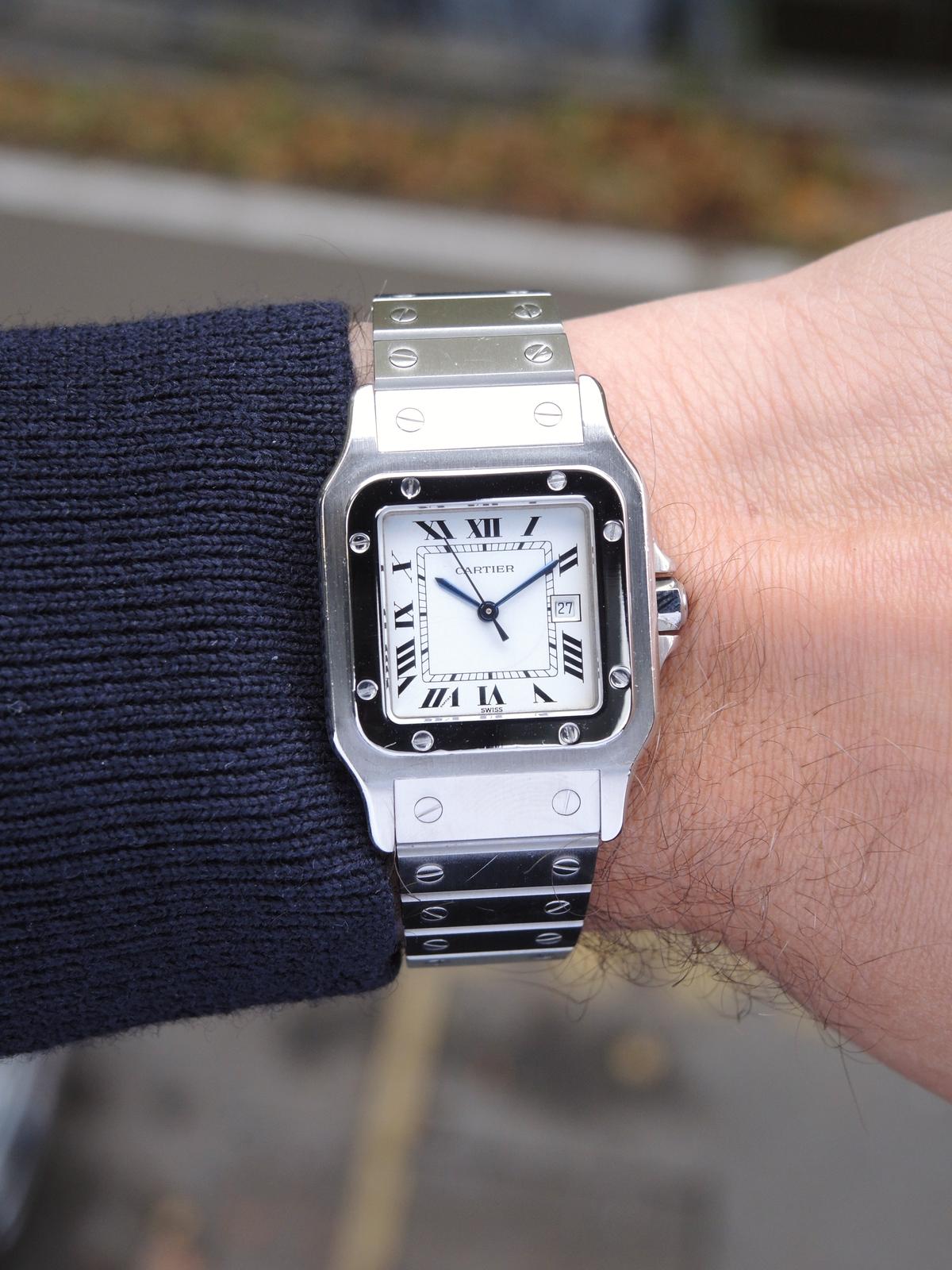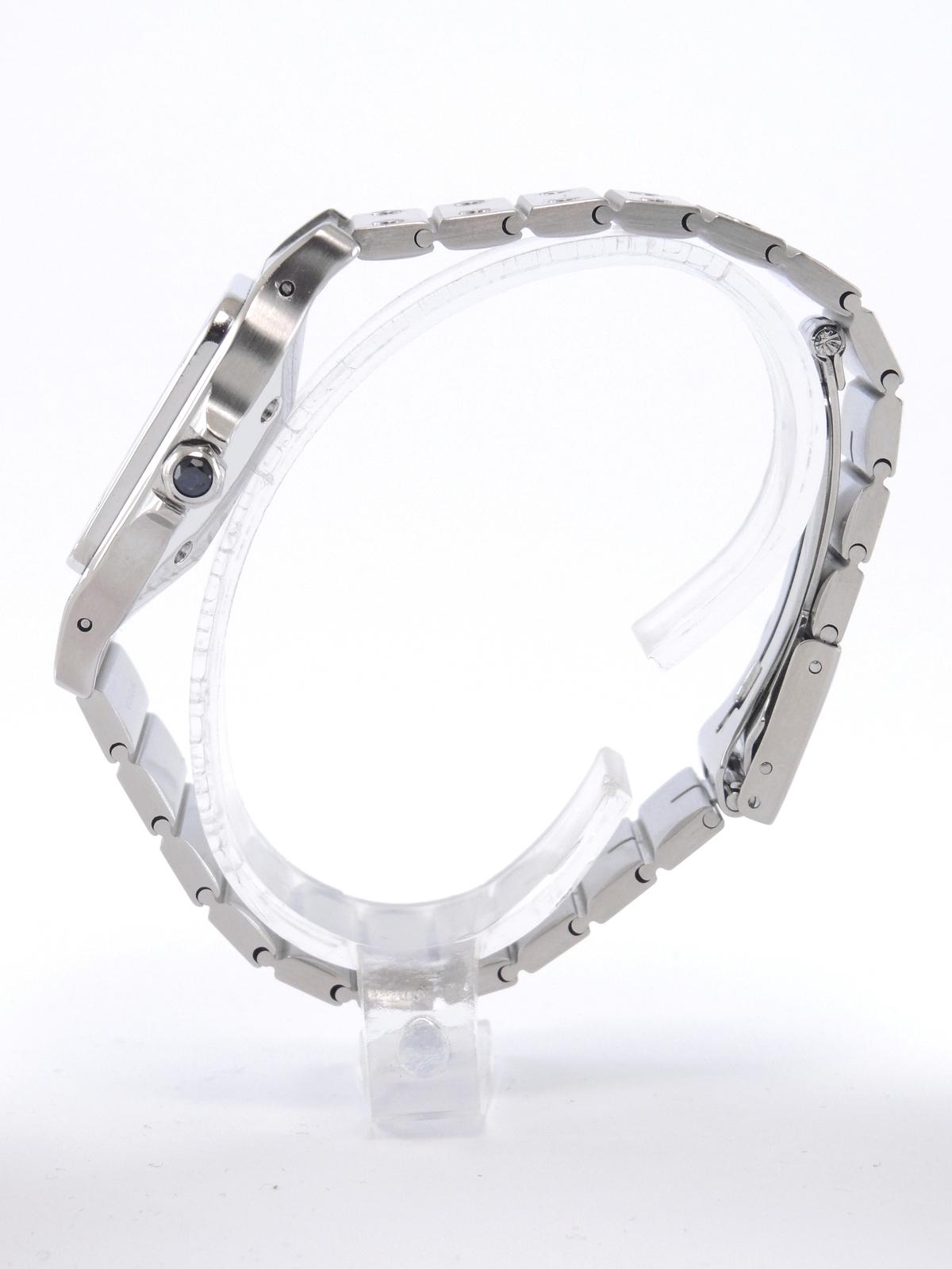 Santos Galbée 2960 - Complet acier, 29 x 41 mm, cadran blanc, index chiffres romains, chemin de fer, date, aiguilles "glaives" bleuies, verre saphir, mouvement automatique.