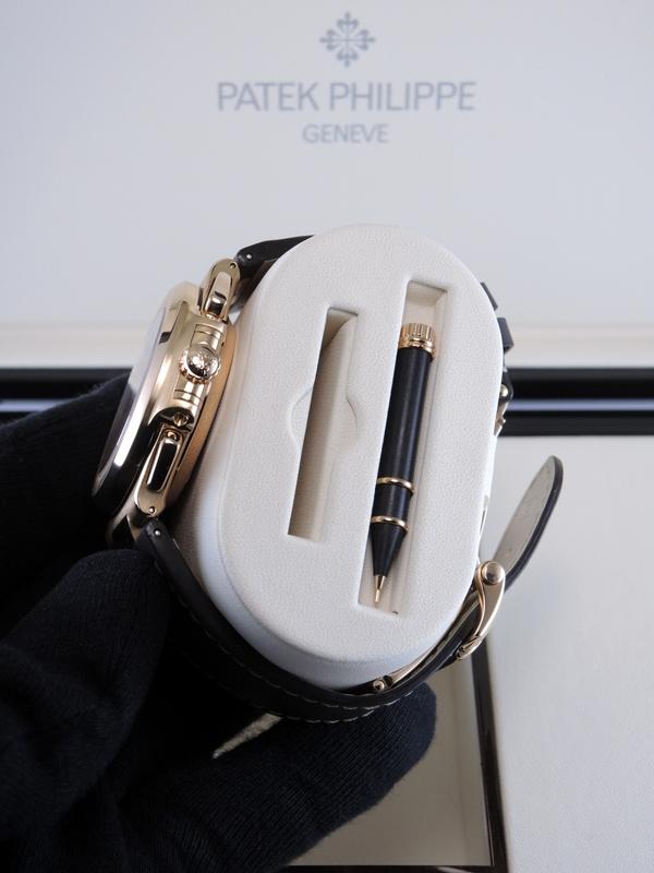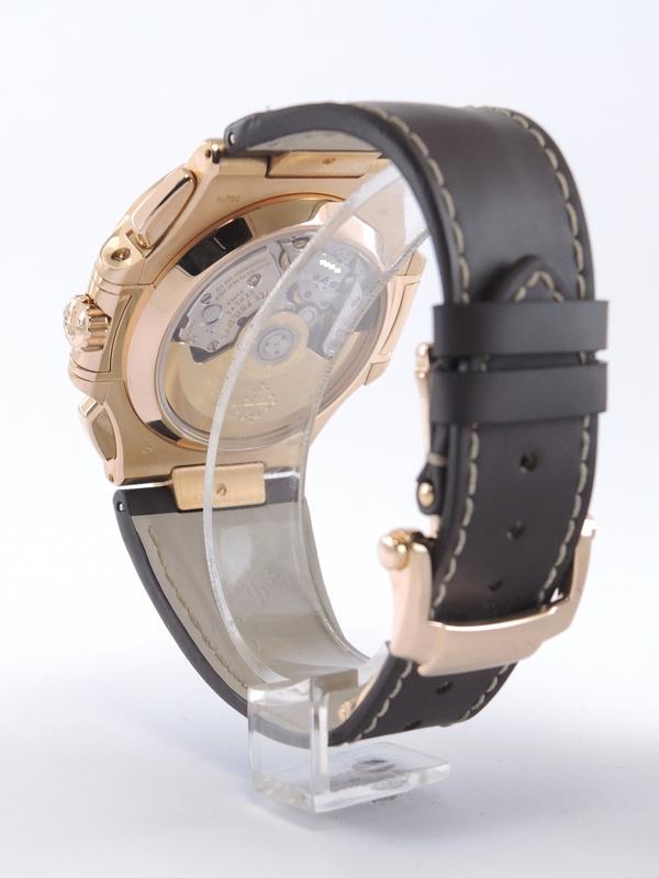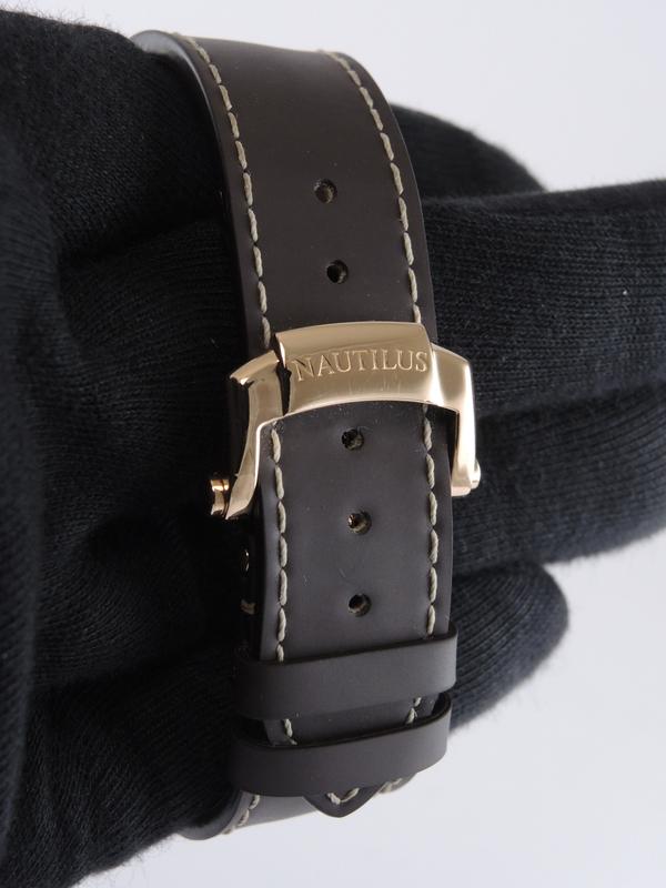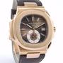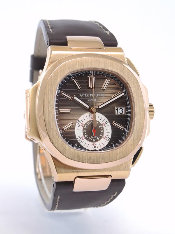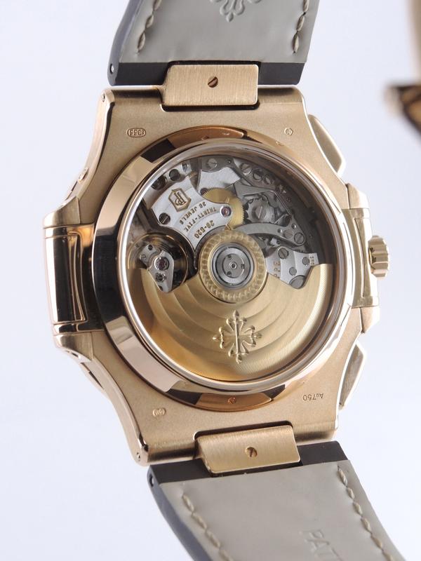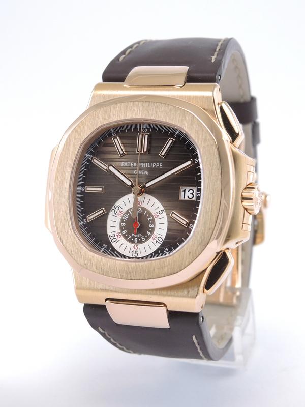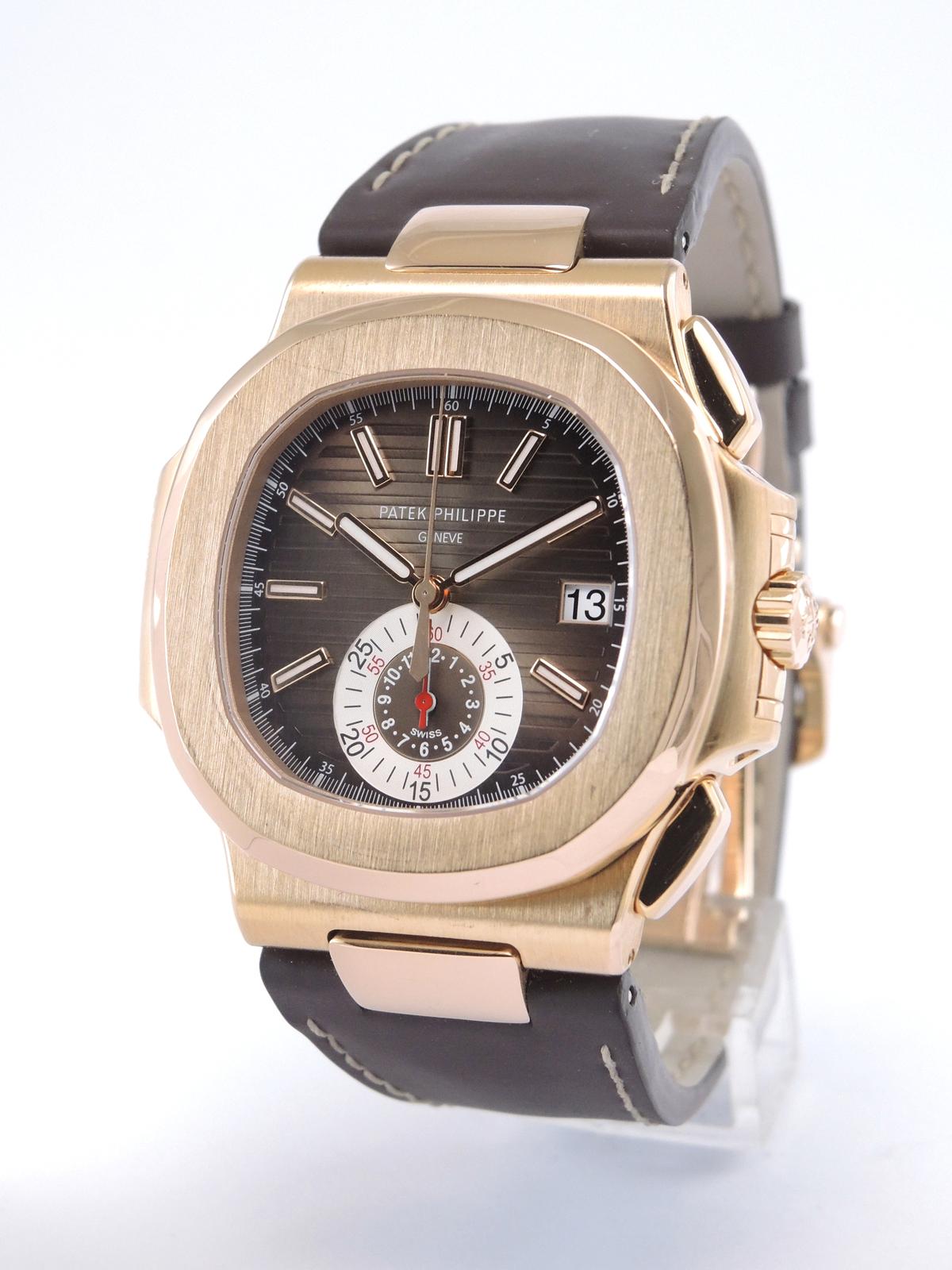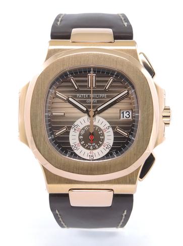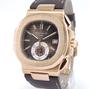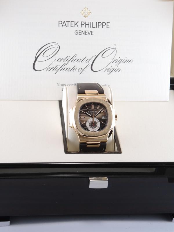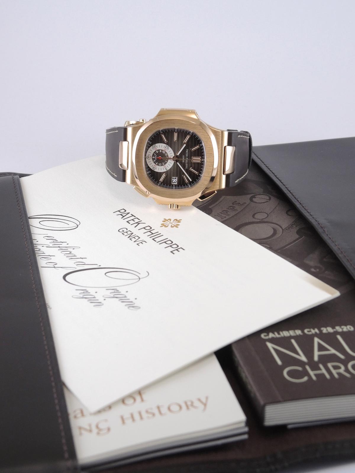 Nautilus Chronograph 5980 R-001 Set Complet - Boitier or rose sur bracelet cuir, boucle déployante, cadran marron, chronographe, mono compteur 60 minutes et 12 heures, verre et fond de boîte saphir, mouvement automatique, calibre CH 28-520 C. Avec boîte et papiers d'origine, set complet !