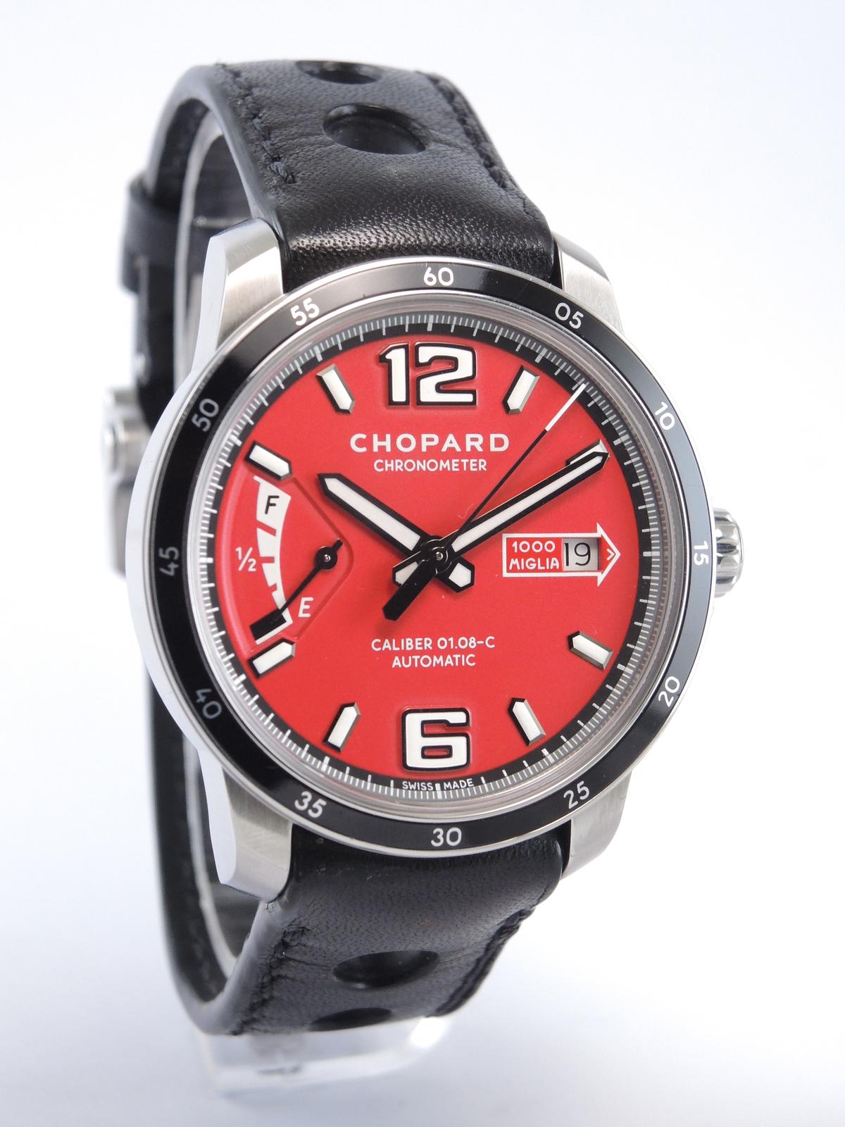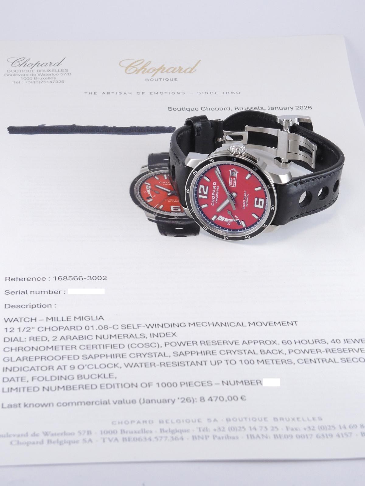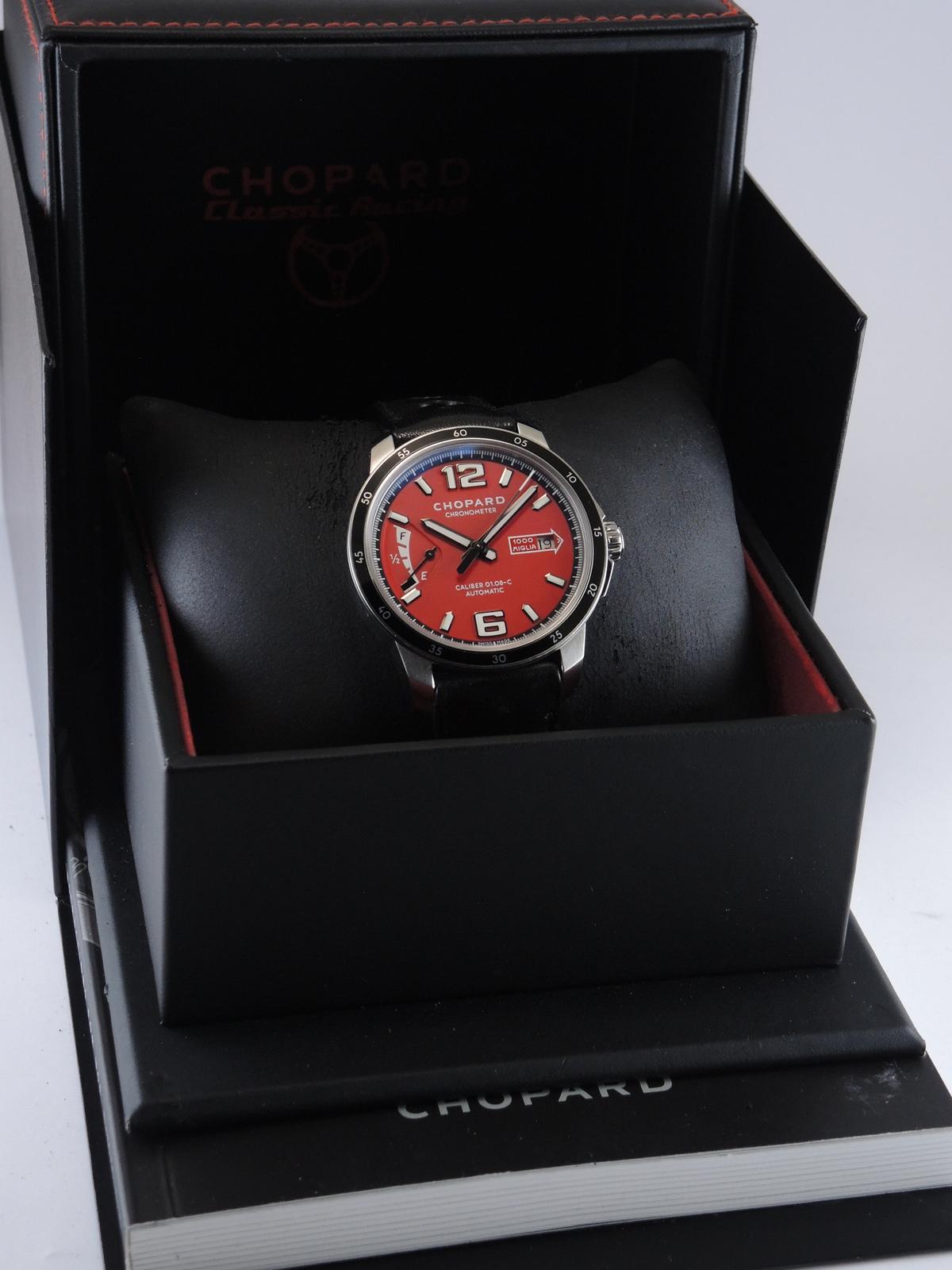Mille Miglia GTS Power 168566 Avec Boîte & Attestation de Valeur - Boitier acier sur bracelet cuir, boucle déployante d'origine, cadran rouge, aiguilles et index luminescents, date, réserve de marche, verre et fond de boîte saphir, couronne vissée, mouvement automatique, calibre 01.08-C. Avec boîte d'origine et attestation de valeur Chopard. Edition limitée à 1.000 exemplaires.