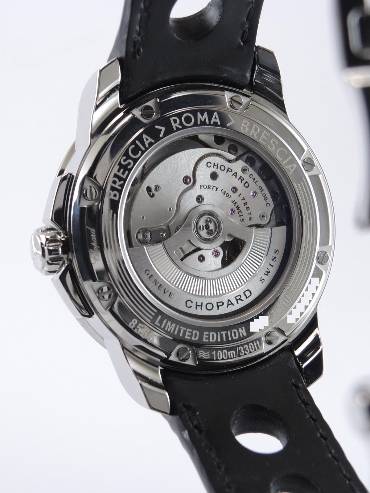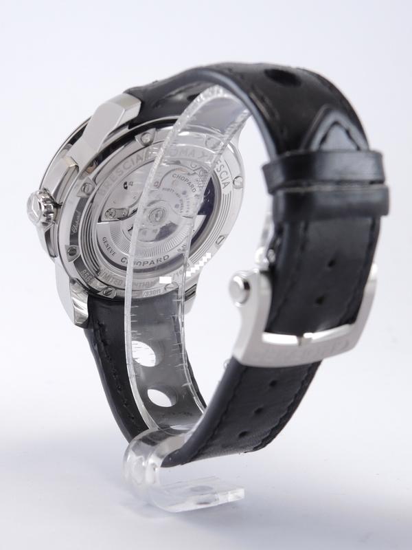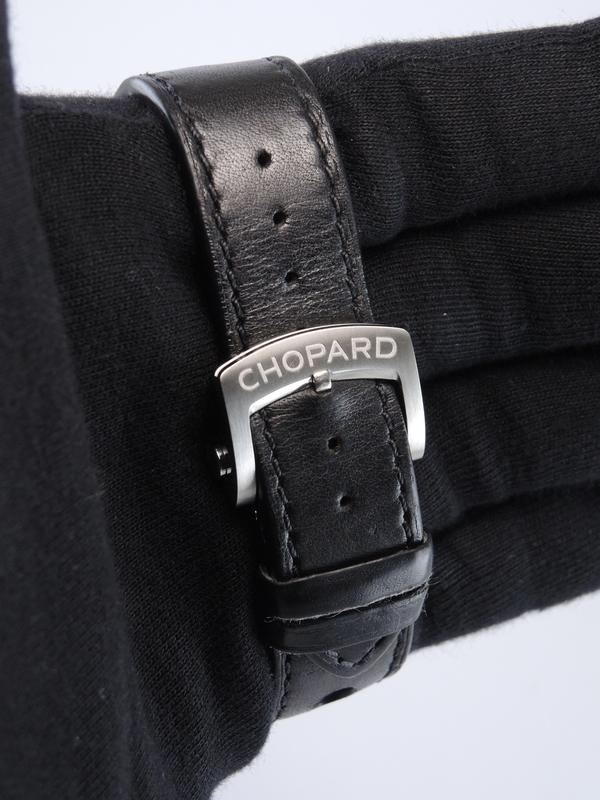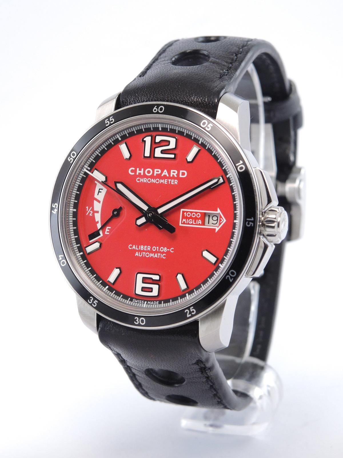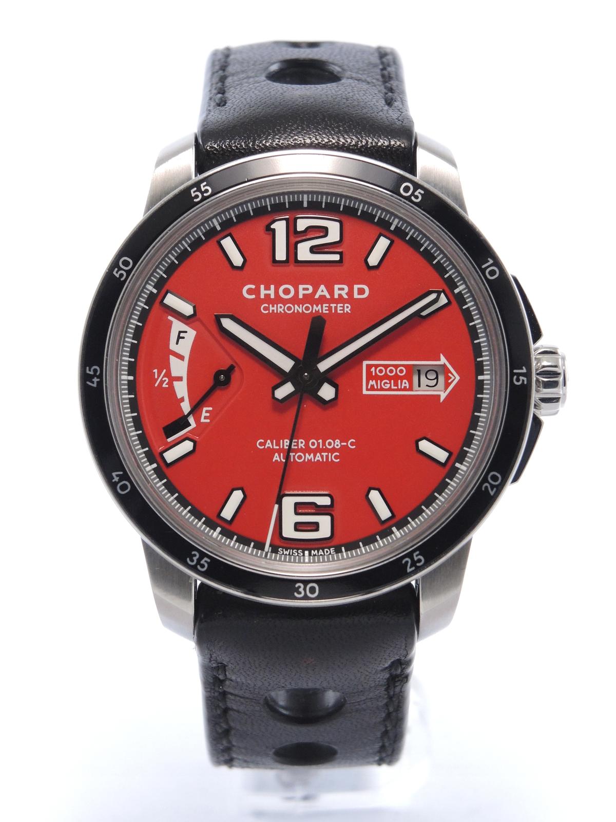 Mille Miglia GTS Power 168566 Avec Boîte & Attestation de Valeur - Boitier acier sur bracelet cuir, boucle déployante d'origine, cadran rouge, aiguilles et index luminescents, date, réserve de marche, verre et fond de boîte saphir, couronne vissée, mouvement automatique, calibre 01.08-C. Avec boîte d'origine et attestation de valeur Chopard. Edition limitée à 1.000 exemplaires.