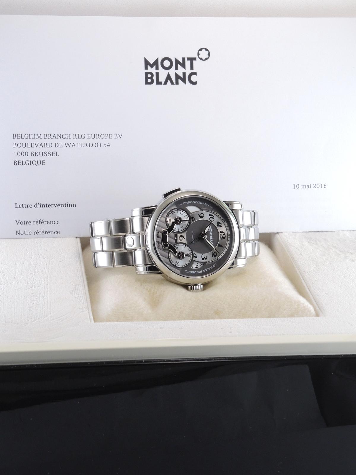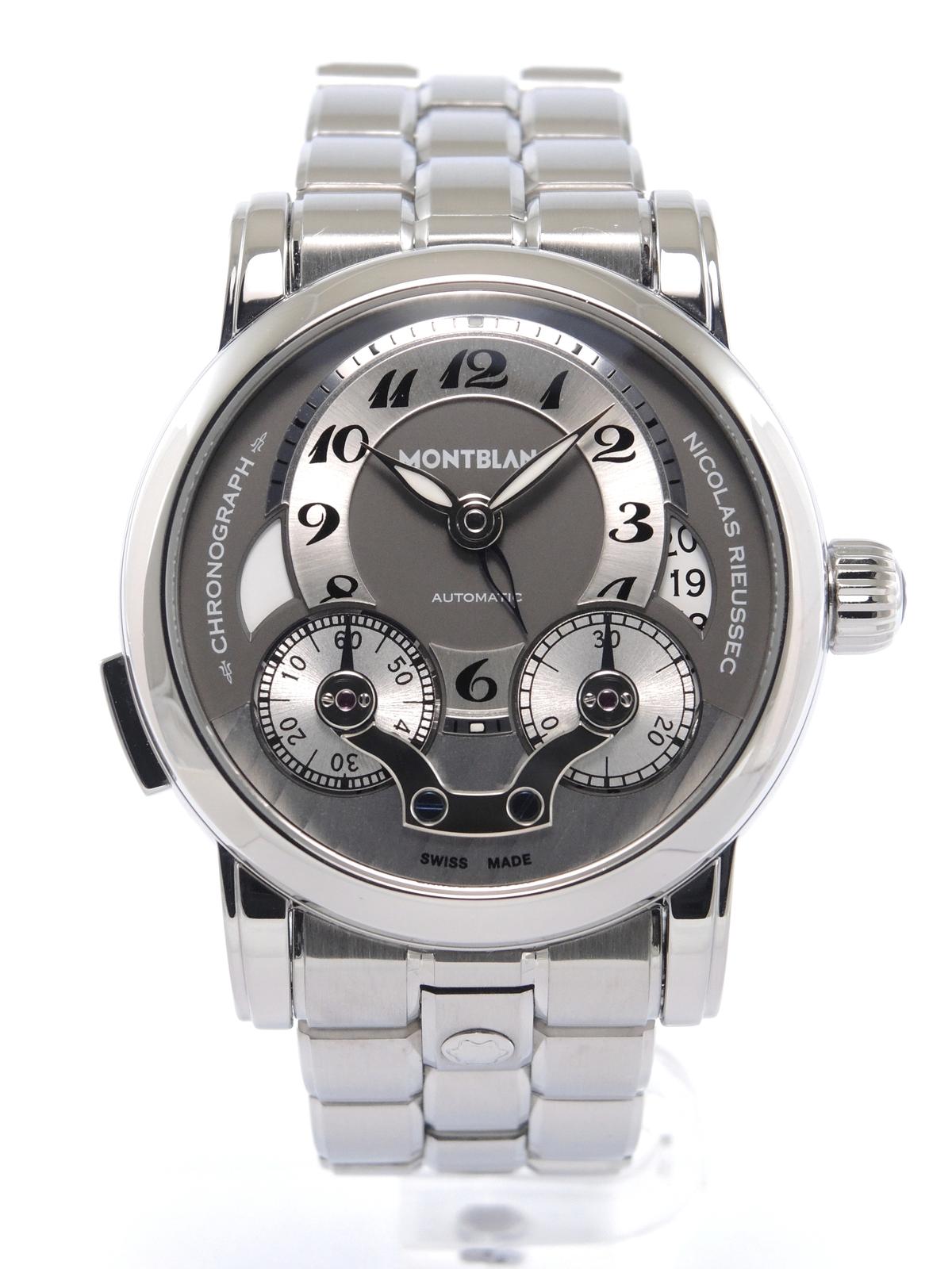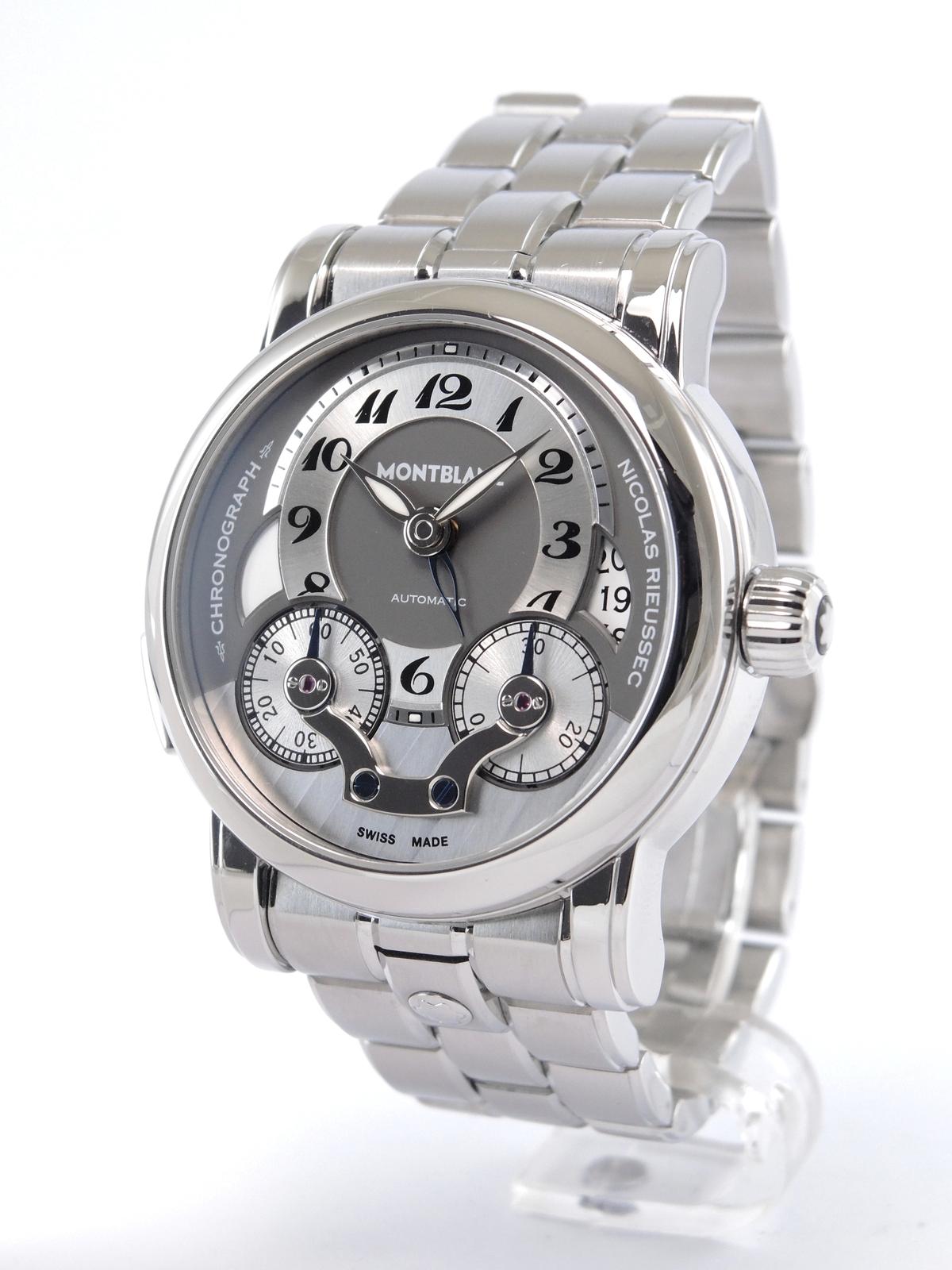 Nicolas Rieussec Avec Boîte & Papier de Service - Complet acier, cadran argenté, index chiffres breguet, chronographe, deux compteurs, second fuseau horaire, date, verre et fond de boîte saphir, mouvement automatique, calibre MB R200. Avec boîte, remontoir et papier de service.