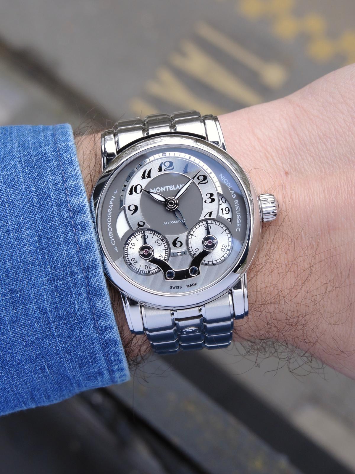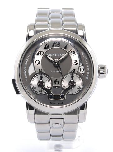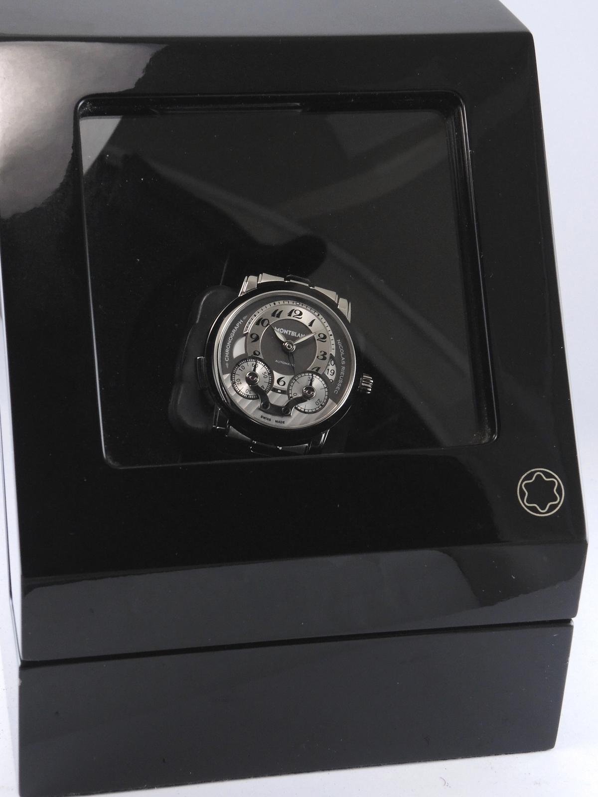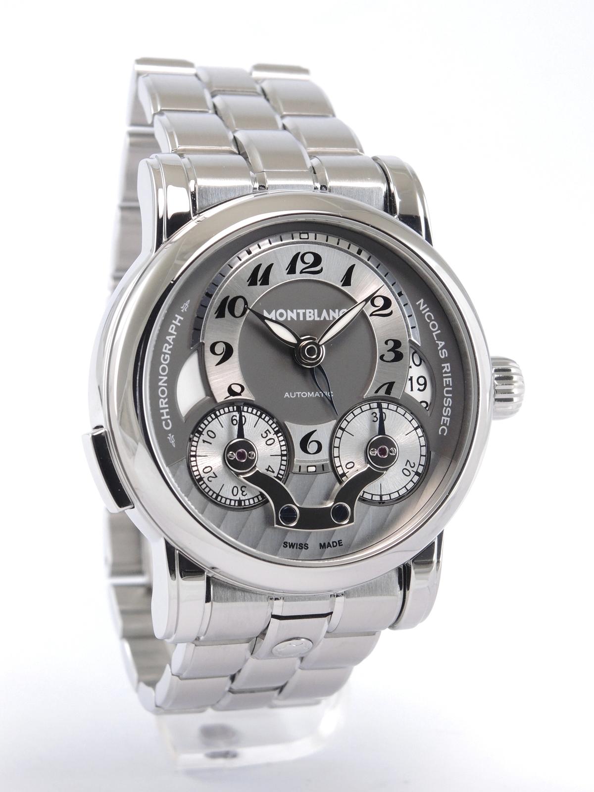 Nicolas Rieussec Avec Boîte & Papier de Service - Complet acier, cadran argenté, index chiffres breguet, chronographe, deux compteurs, second fuseau horaire, date, verre et fond de boîte saphir, mouvement automatique, calibre MB R200. Avec boîte, remontoir et papier de service.