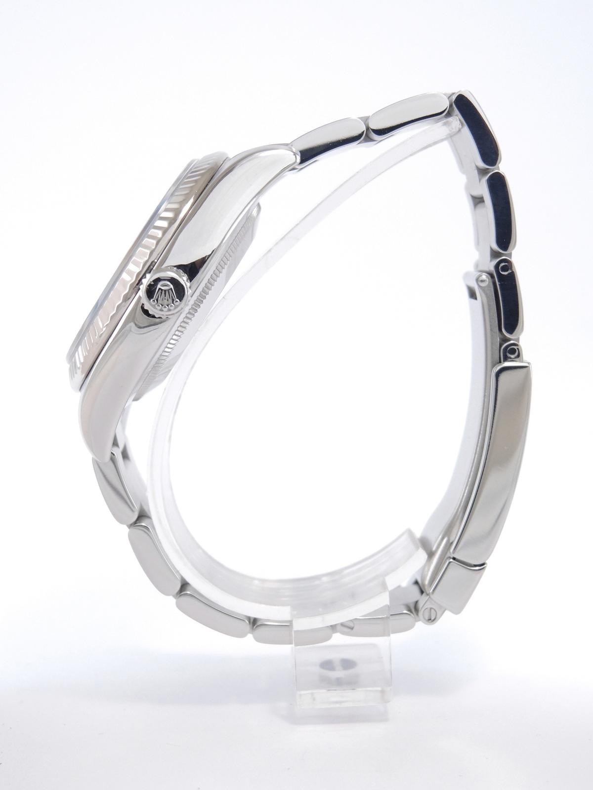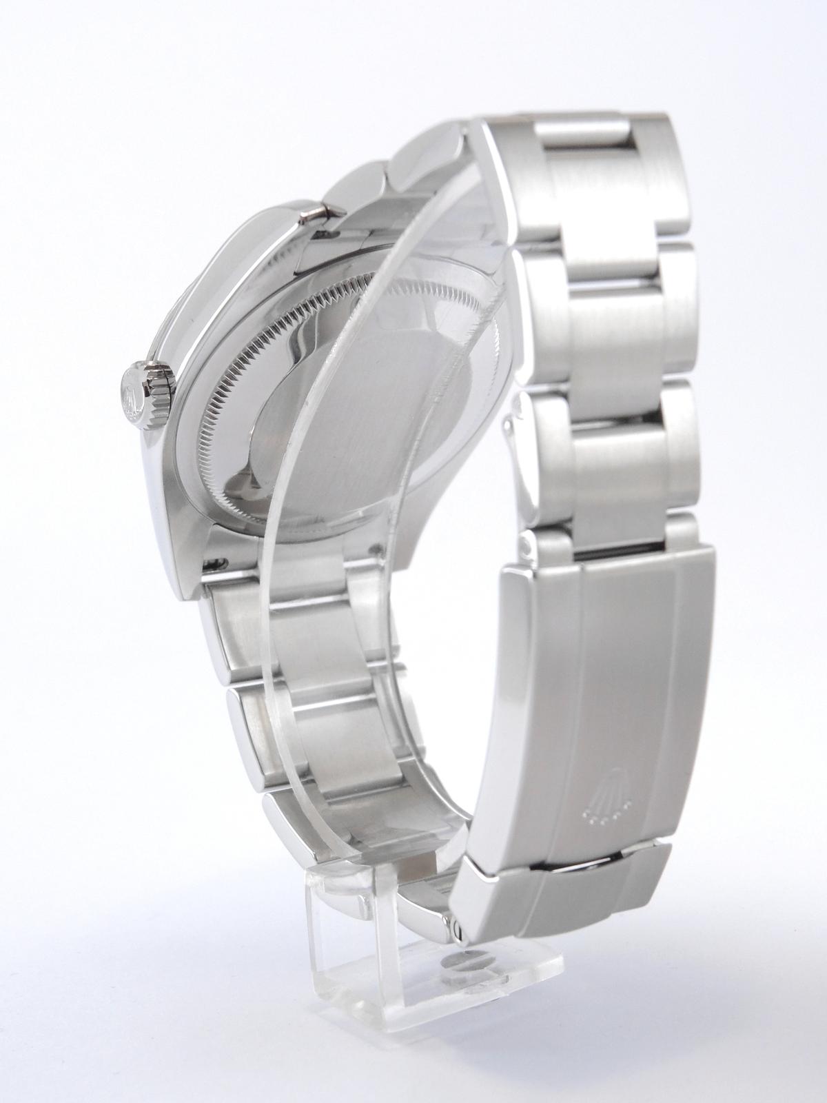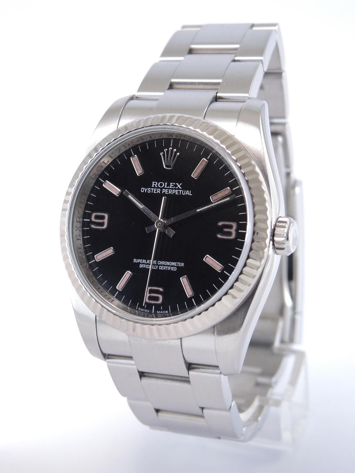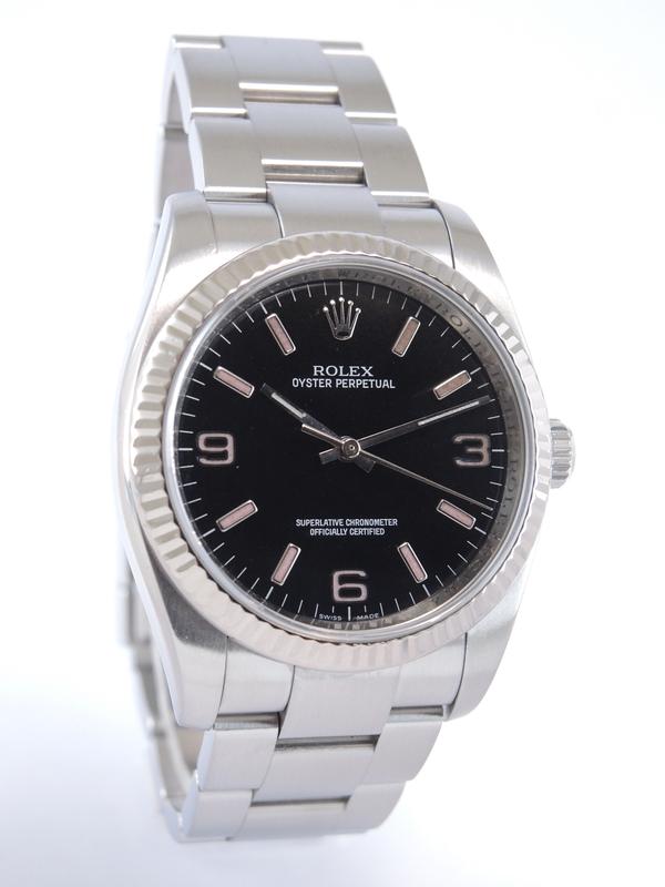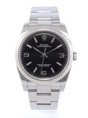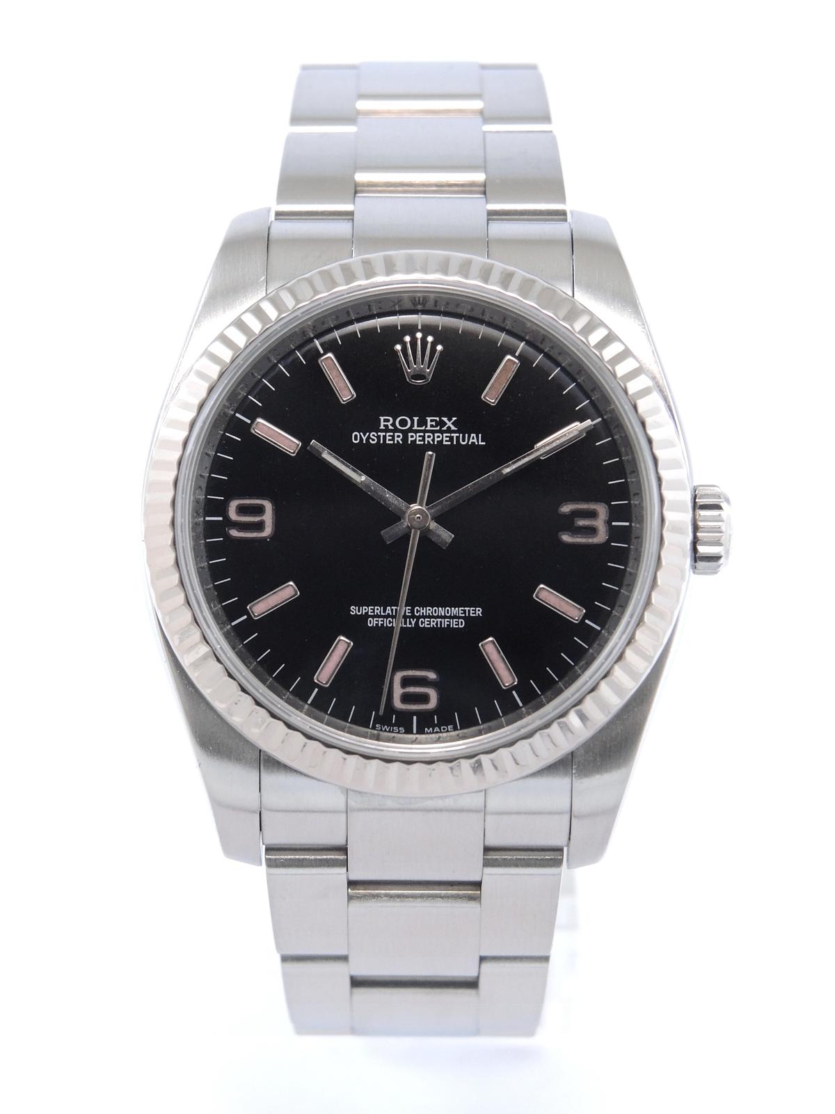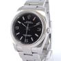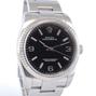 Oyster Perpetual 36 116034 - Complet acier, bracelet Oyster, cadran noir avec indexes roses, lunette cannelée en or blanc, verre saphir, couronne vissée, mouvement automatique certifié chronomètre (COSC).