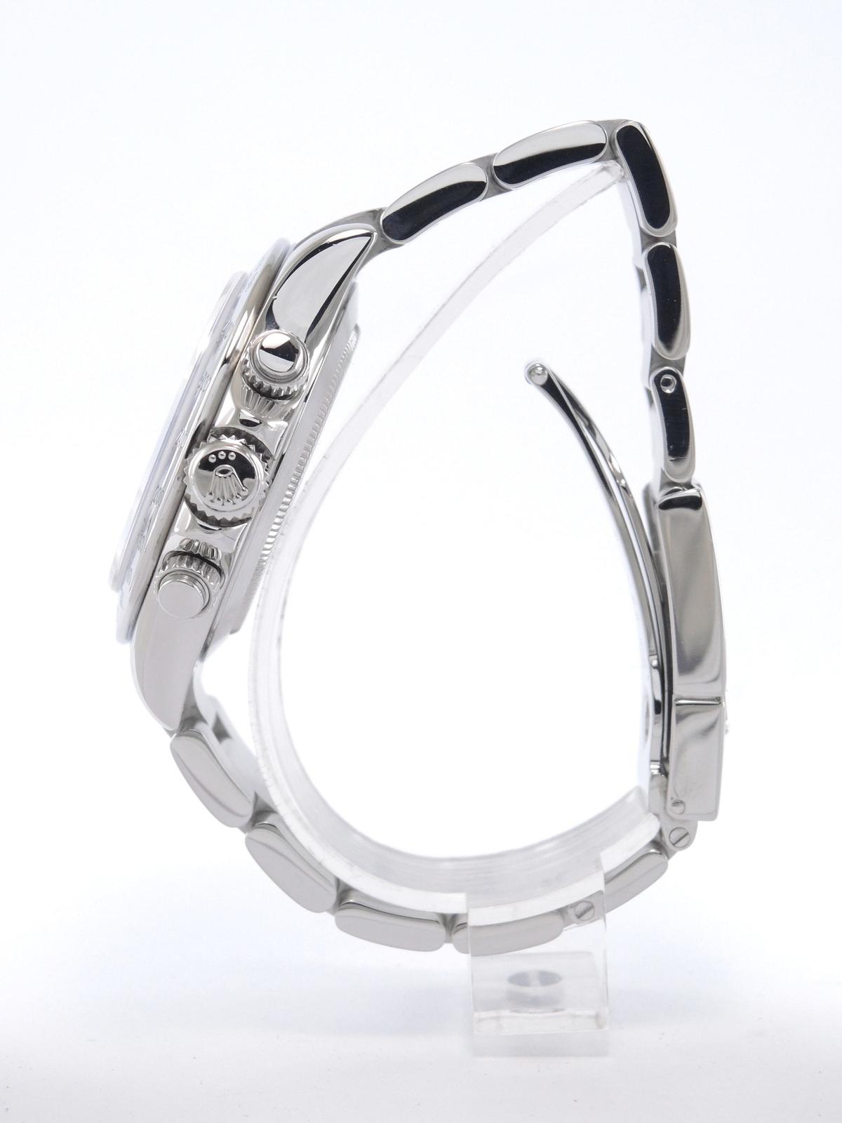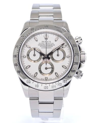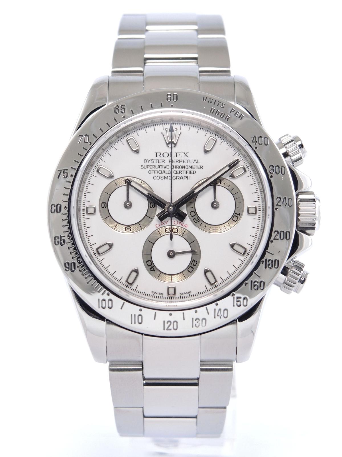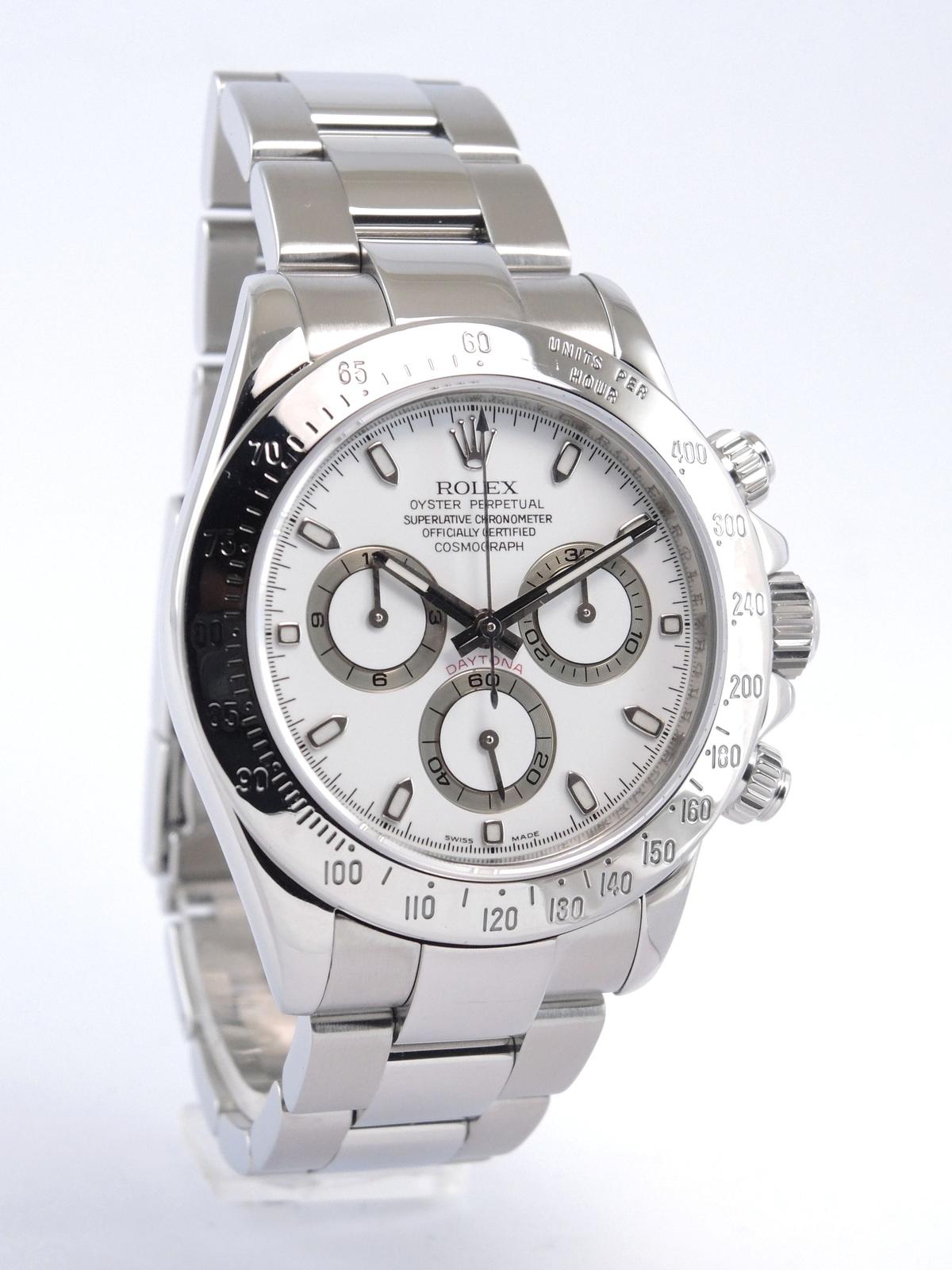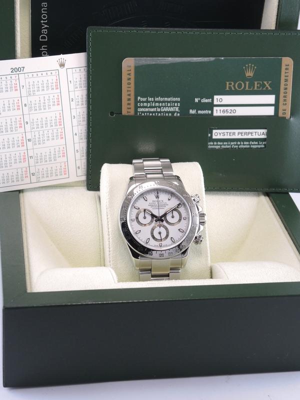Daytona 116520 Full Set - Complet acier, bracelet Oyster, cadran blanc, chronographe, trois compteurs, verre saphir, couronne et poussoirs vissés, mouvement automatique certifié chronomètre (COSC). Avec boite et papiers d'origine, set complet !