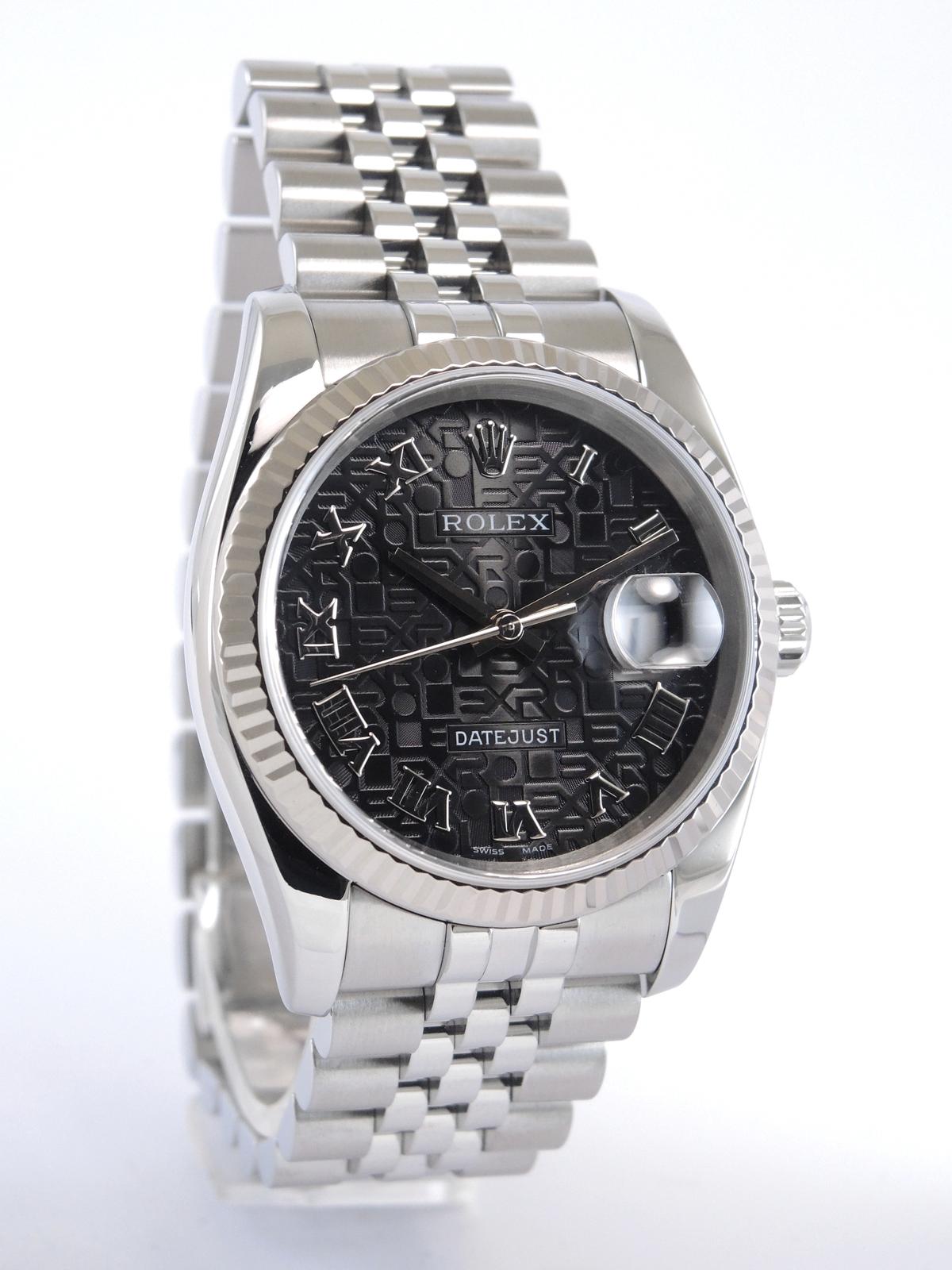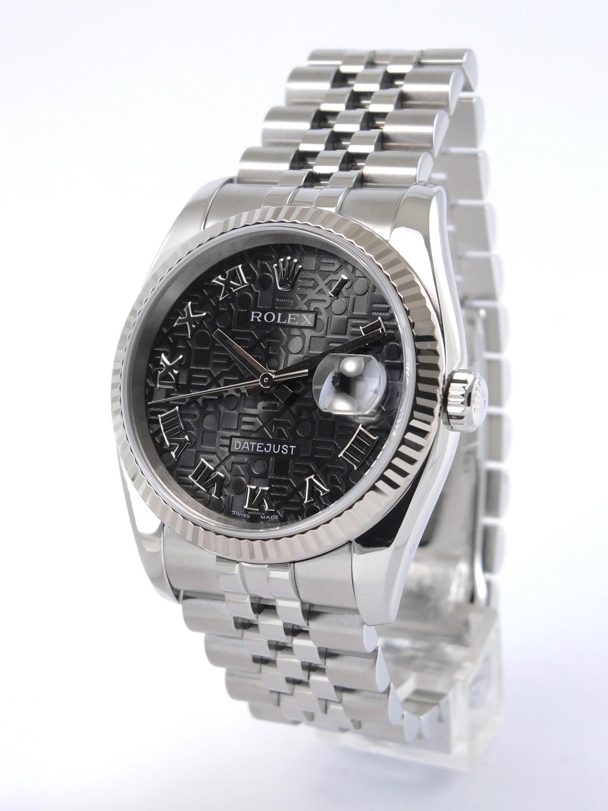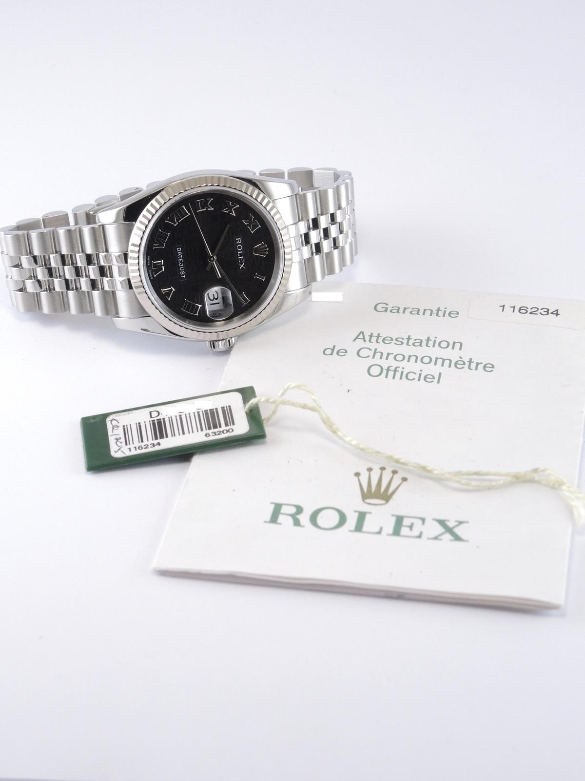 Datejust 116234 Avec Certificat - Complet acier, bracelet Super Jubilé, cadran noir "Jubilé", index chiffres romains appliqués, date, verre saphir, lunette cannelée en or blanc, couronne vissée, mouvement automatique certifié chronomètre (COSC). Avec papier d'origine.