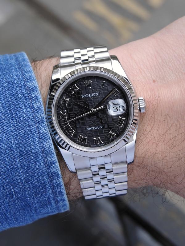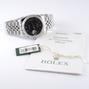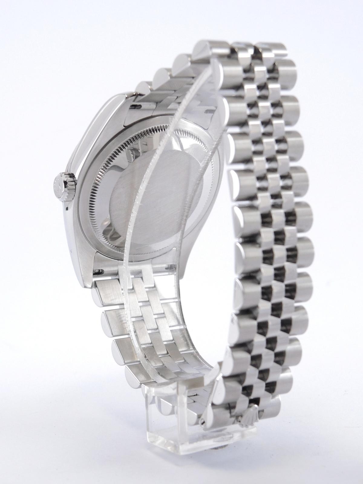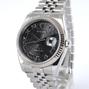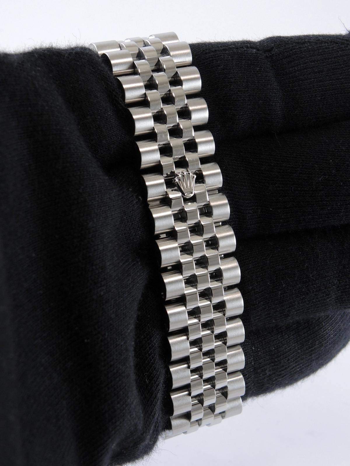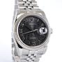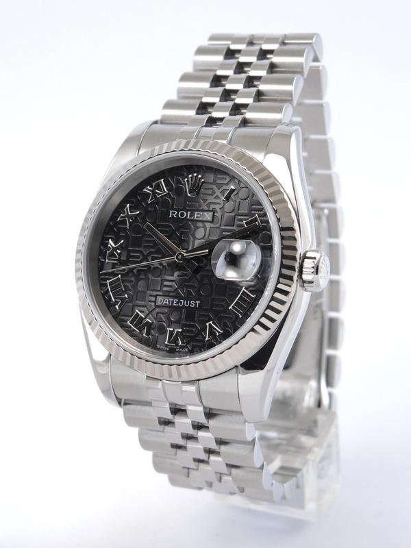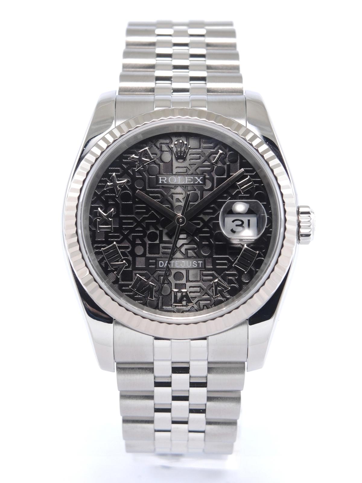 Datejust 116234 Avec Certificat - Complet acier, bracelet Super Jubilé, cadran noir "Jubilé", index chiffres romains appliqués, date, verre saphir, lunette cannelée en or blanc, couronne vissée, mouvement automatique certifié chronomètre (COSC). Avec papier d'origine.