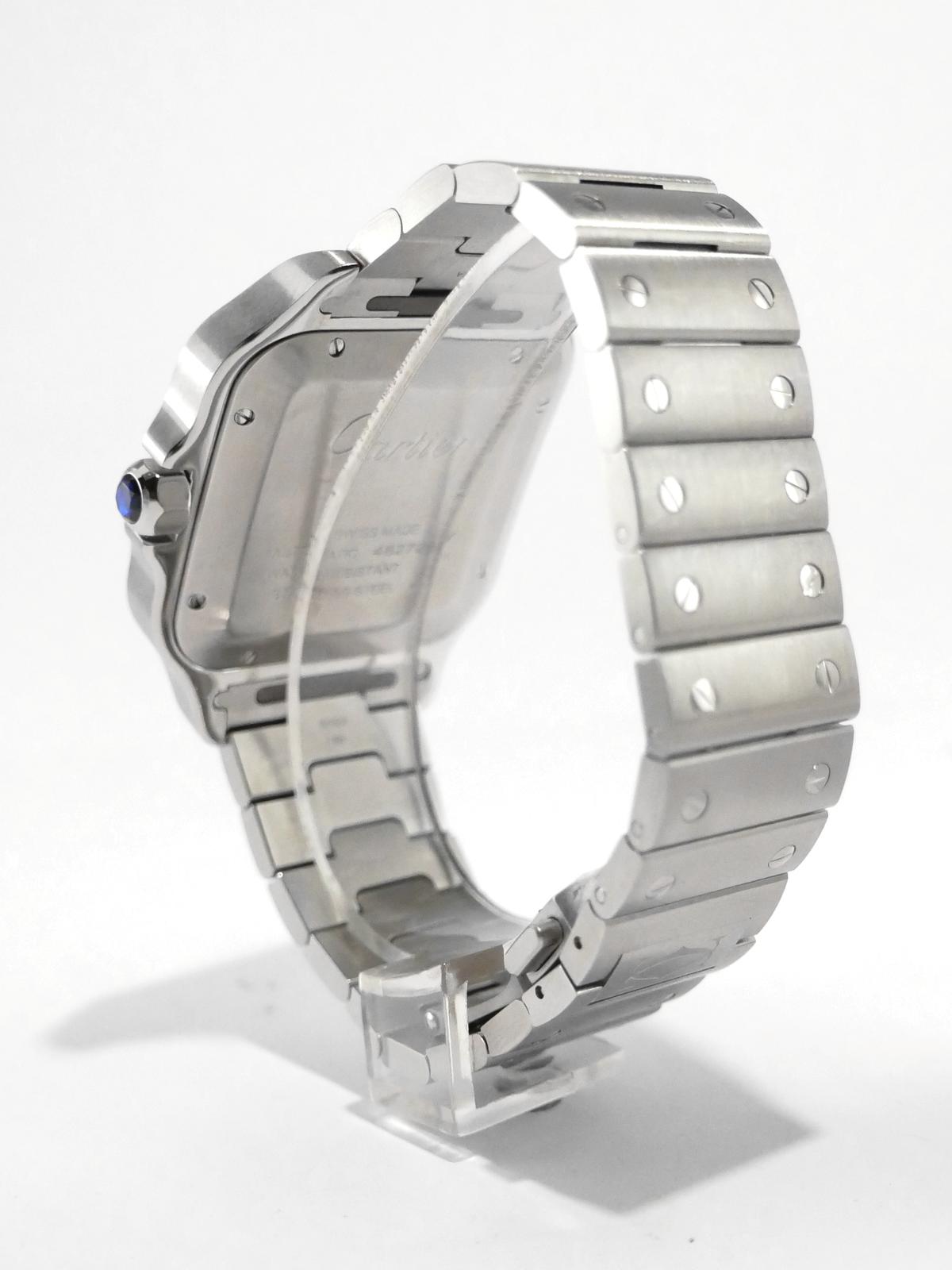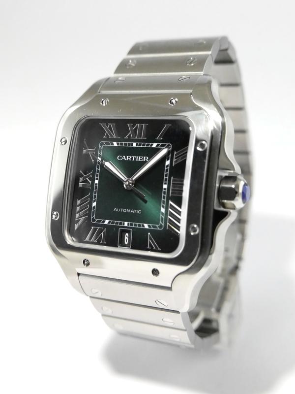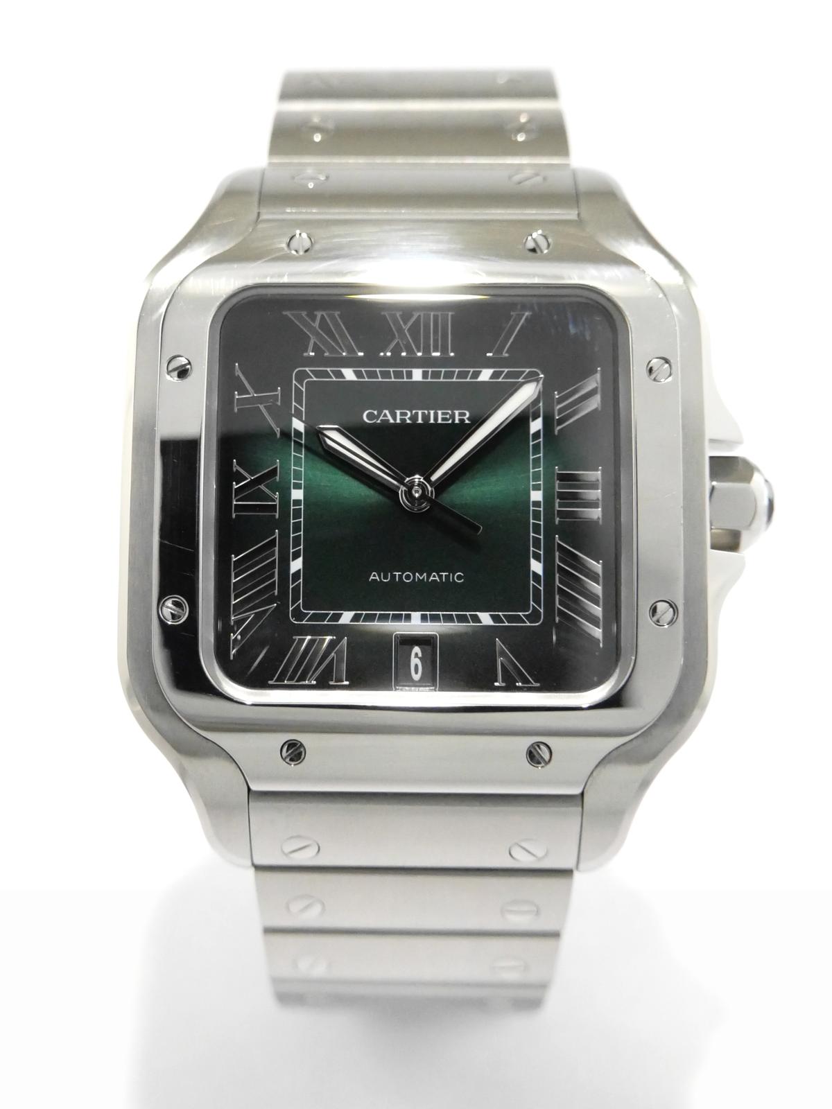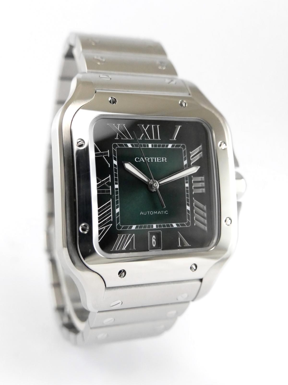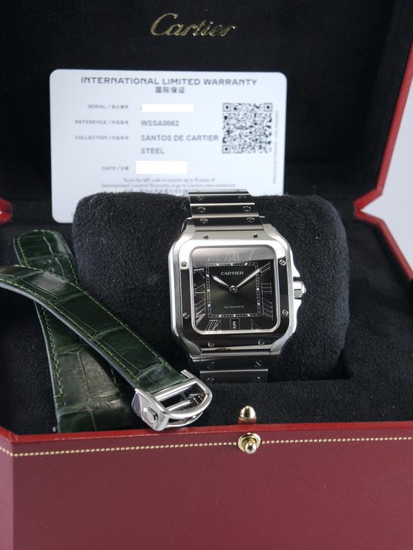 Santos Grand Modèle WSSA0062 Full Set 2024 - Complet acier, bracelet cuir supplémentaire, cadran vert soleillé, index chiffres romains, aiguilles glaives, date, verre saphir, mouvement automatique. Avec boîte et papiers d'origine, set complet !