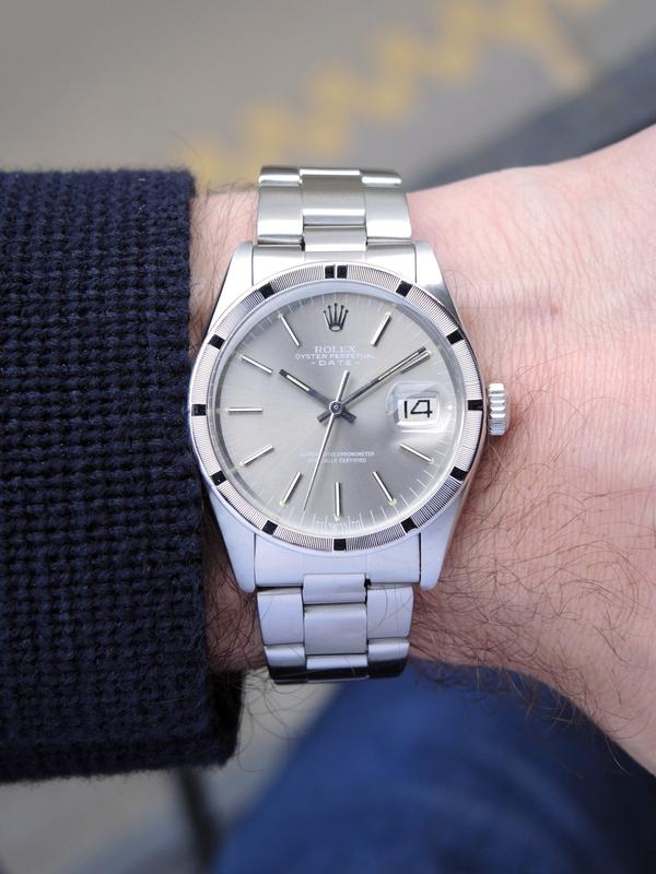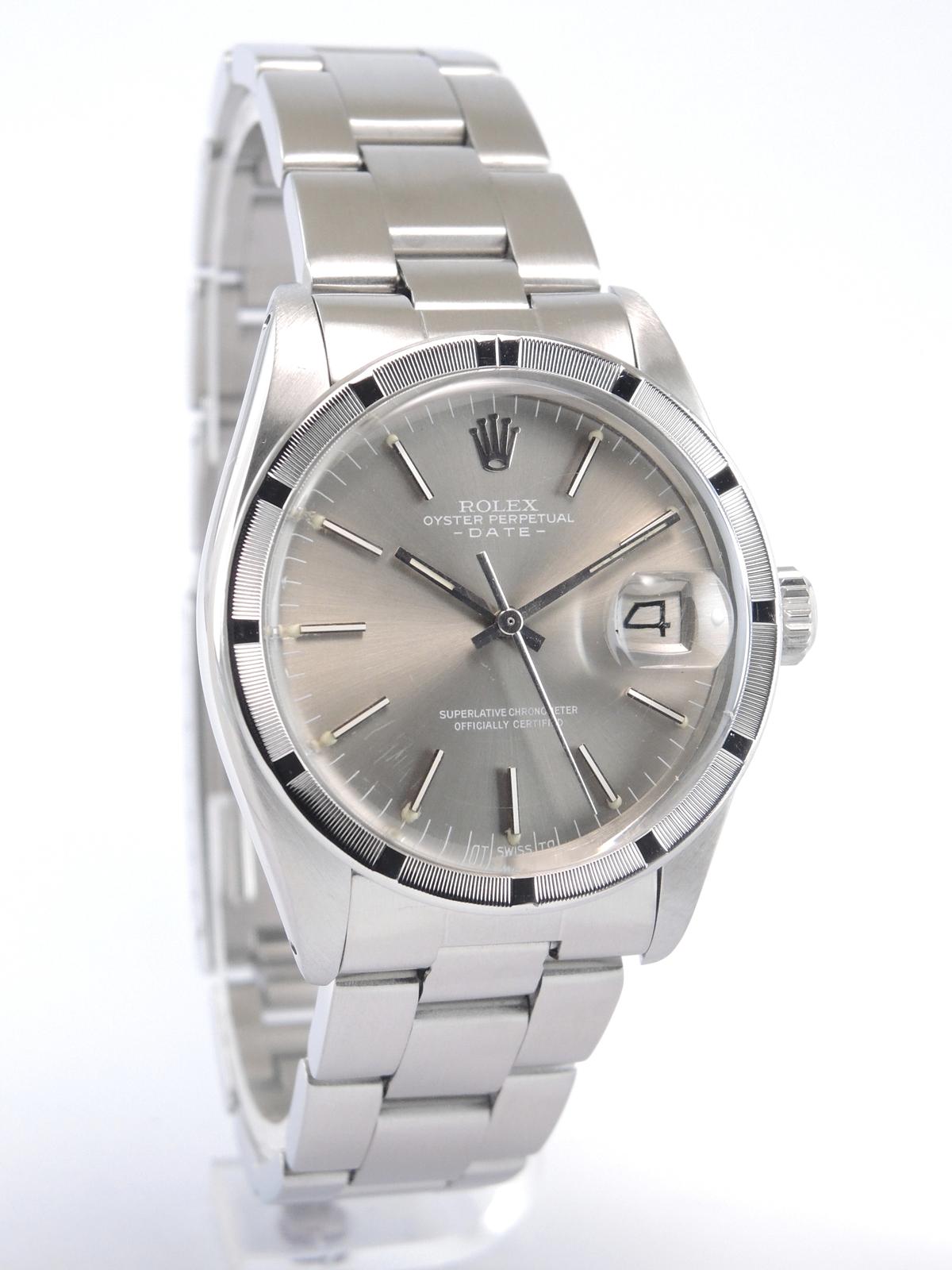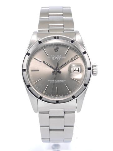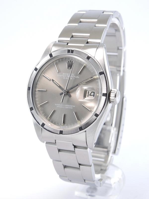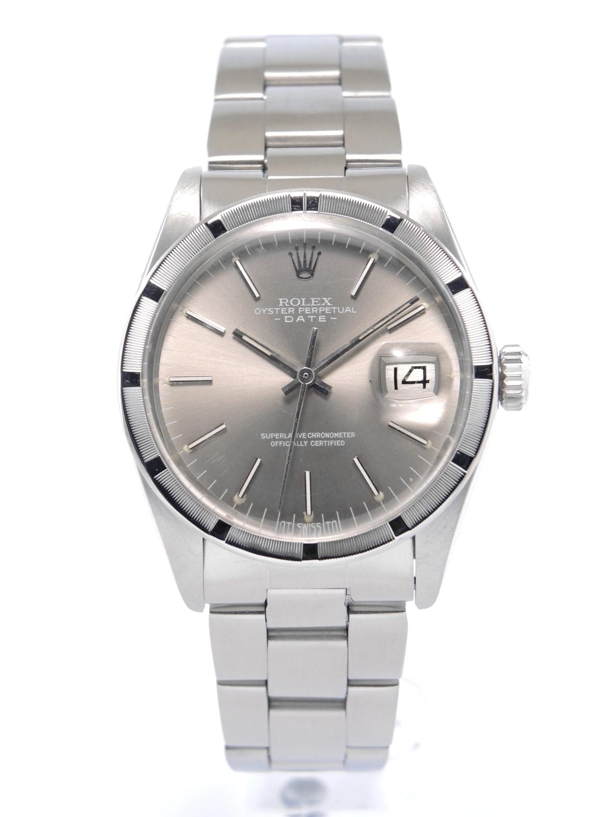 Date 1501 "Sigma" Ghost Dial - Complet acier, bracelet Oyster, cadran gris soleil "Sigma" "Ghost", index bâtons appliqués, date, verre plexi, lunette cannelée en acier, couronne vissée, mouvement automatique.