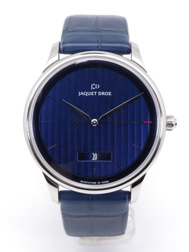 New Jaquet Droz Grande Heure Minute Quantieme full set UNWORN Ref J017530241 Steel case on blue gray crocodile strap with JD steel pin buckle, blue dial decorated with a linear "Côtes de Genève" pattern, date at 6 o'clock, sapphire crystal and caseback, automatic Jaquet Droz 1150P caliber movement, silicon balance wheel and heavy metal oscillating weight. 28,800 vibrations per hour and power reserve of approximately 68 hours. Delivered with box and papers (blank), new condition 5 950 € Luxembourg
