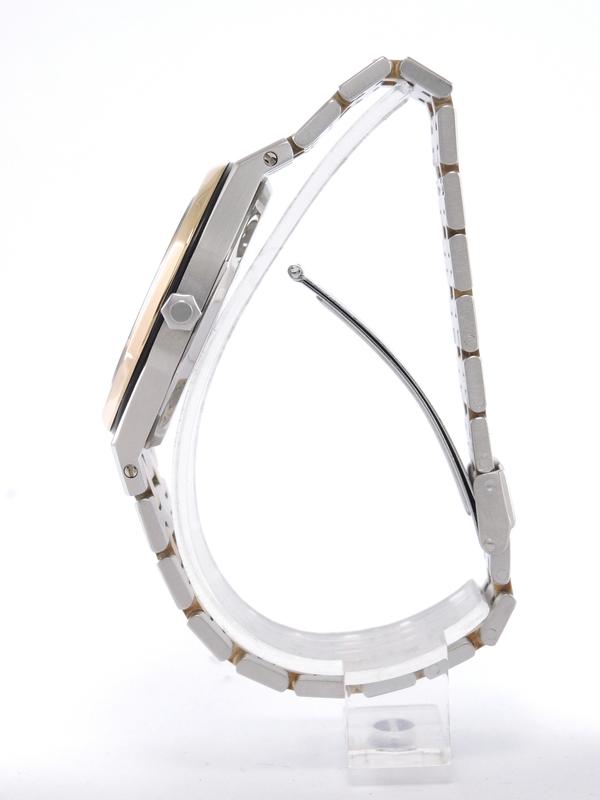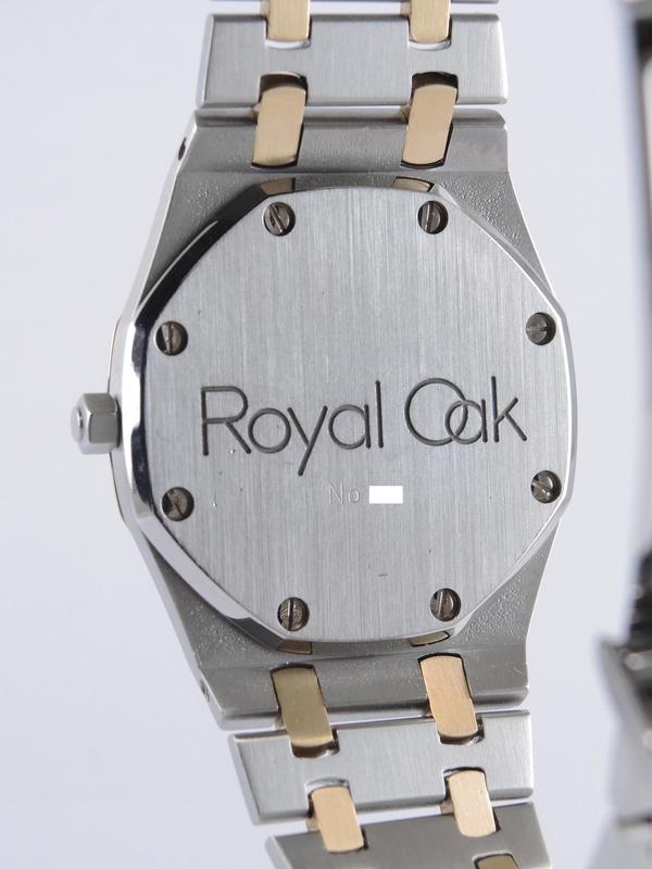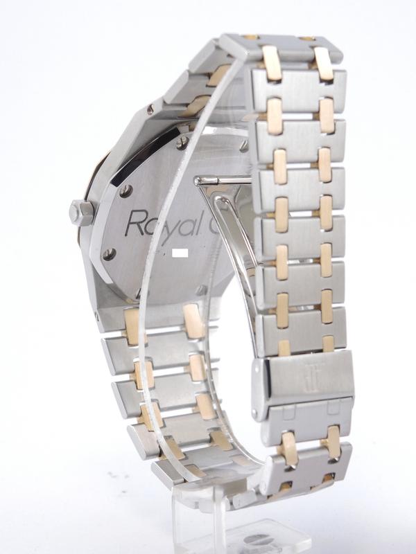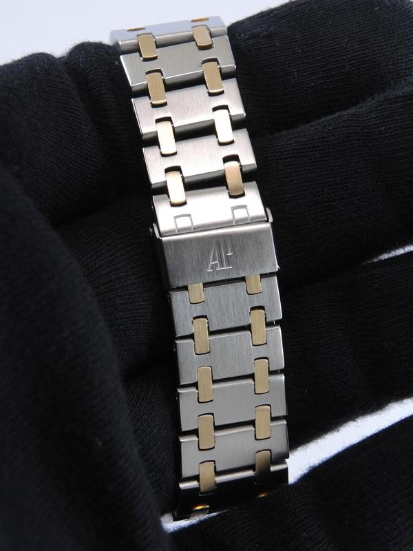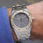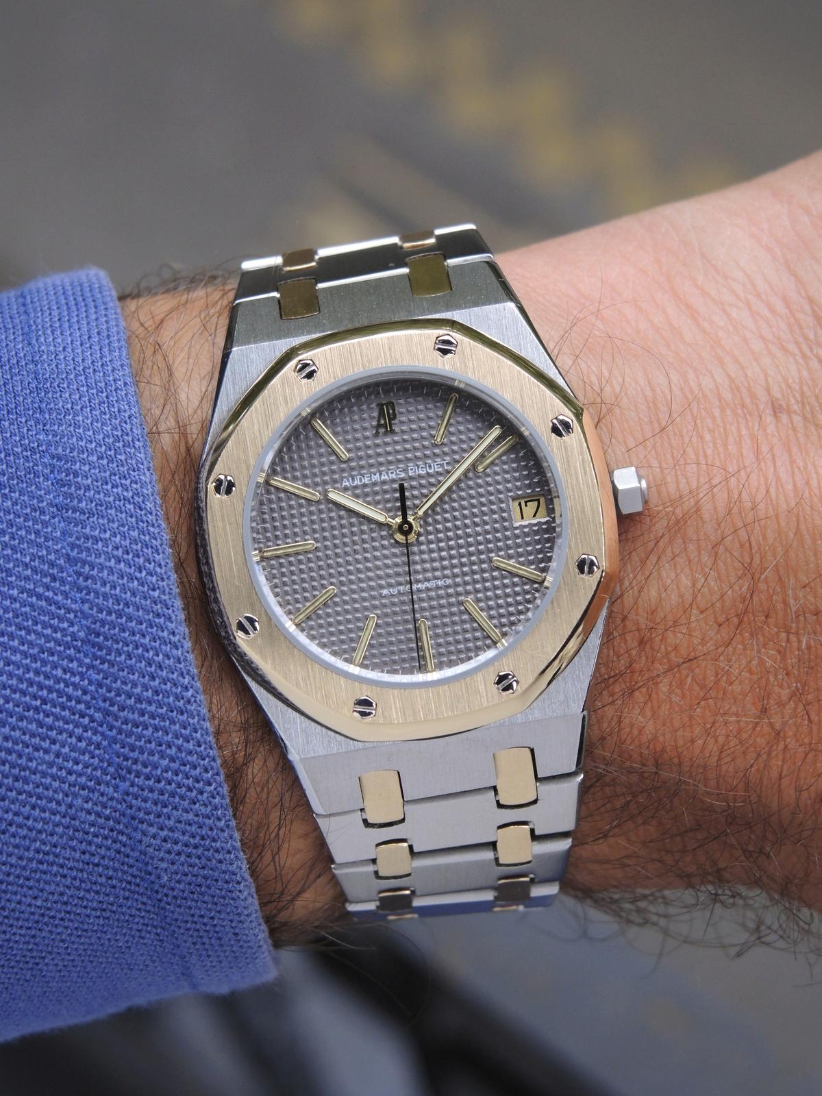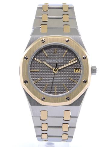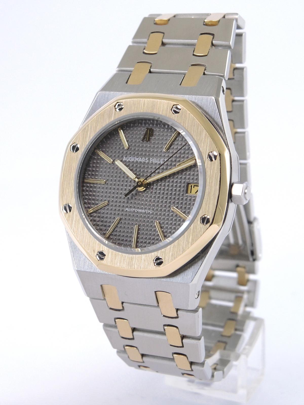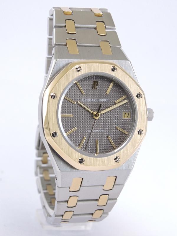 Royal Oak 4100 SA - Full yellow gold and steel, grey tapestry dial, applied stick markers, "old font" logo, date, sapphire glass, screw down crown, automatic movement. Gerald Genta's masterpiece!