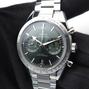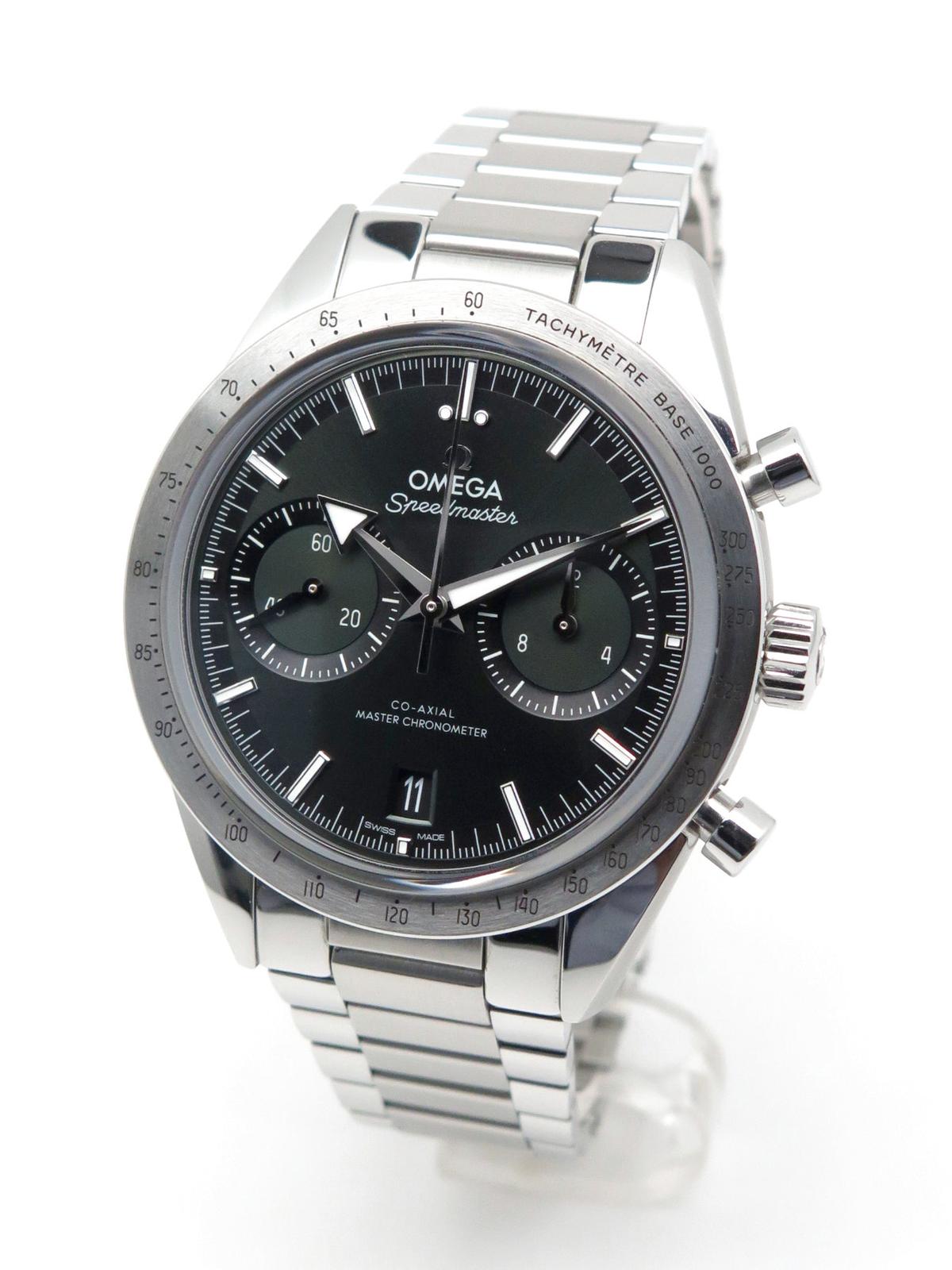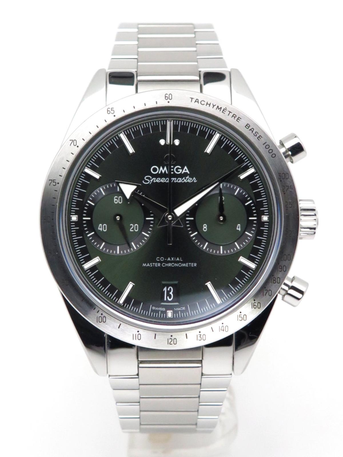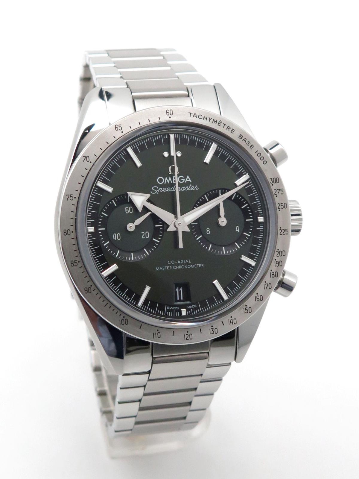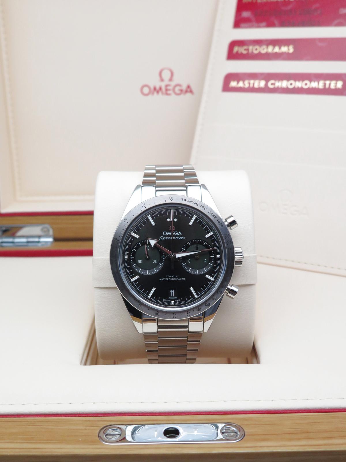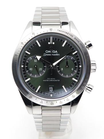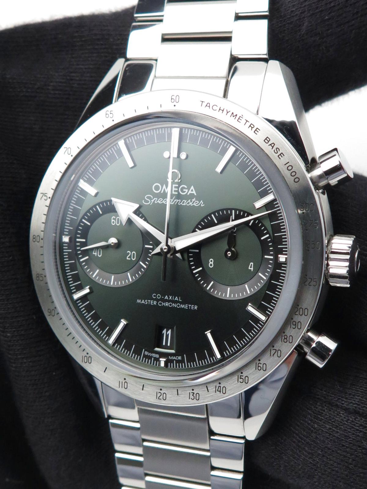 Speedmaster 57 green full set - Ref 332.10.41.51.10.001 Steel case on steel bracelet with folding clasp, fixed steel bezel, green dial, chronograph with 2 counters, date at 6 o'clock, co-axial manual winding movement caliber 9906 with 60 hours of power reserve, delivered with box, on original Omega box and papers