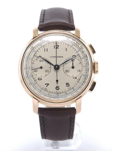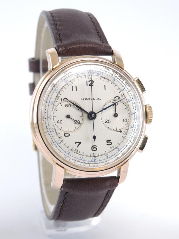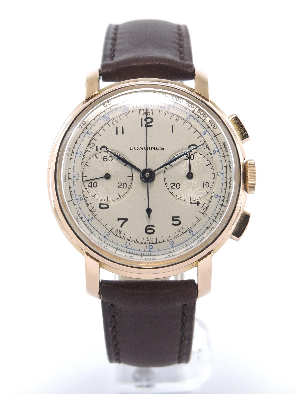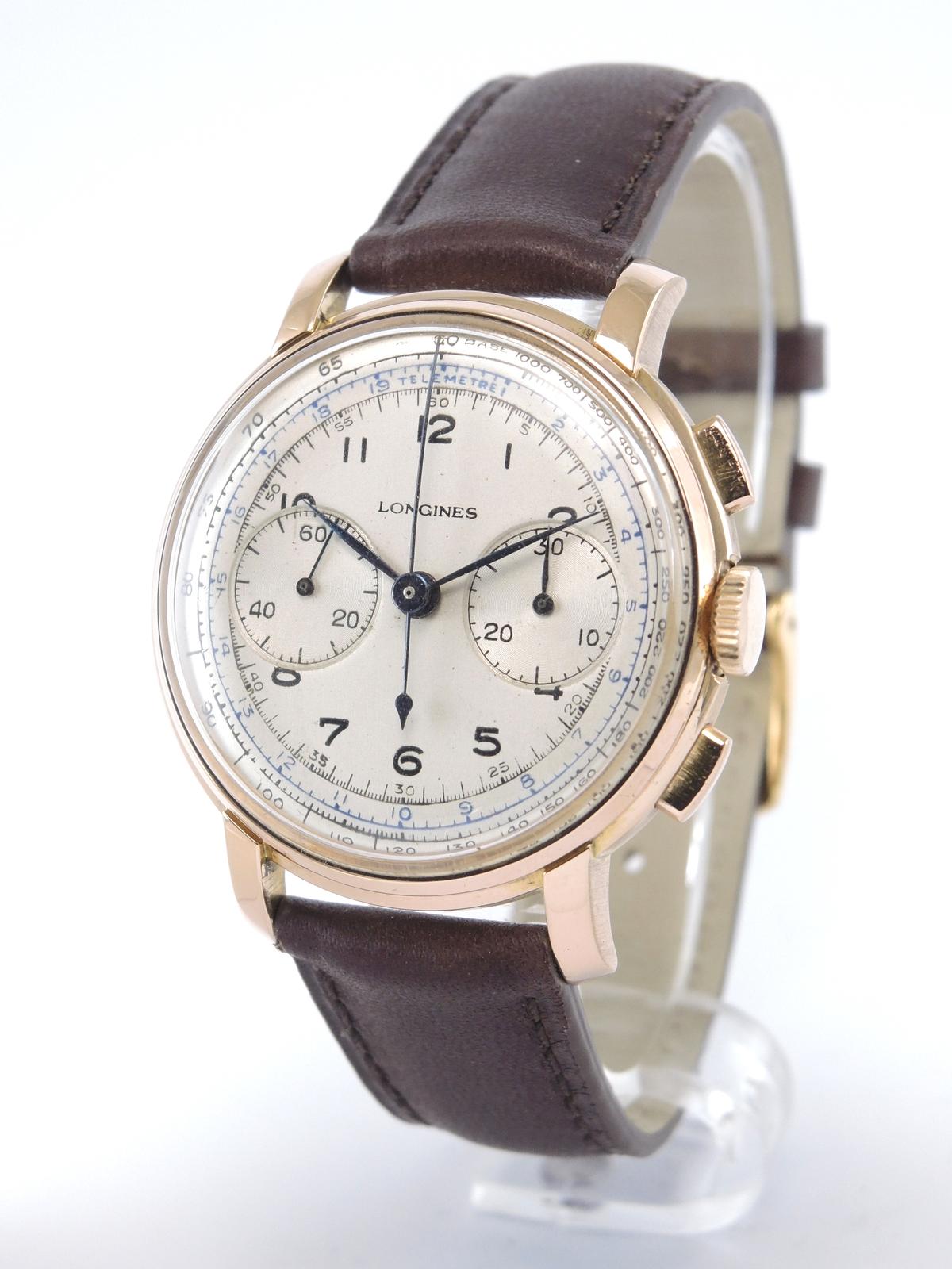 Chronographe 13 ZN - Rose gold case on a leather strap, pin buckle, restored silver dial with arabic numeral markers, chronograph with two subdials, tachymeter and telemeter scales, plexiglass, hand wound movement, caliber 13ZN. The Longines 13ZN is regarded as one of the most technically advanced and aesthetically refined chronograph movements ever produced, even by modern standards.