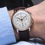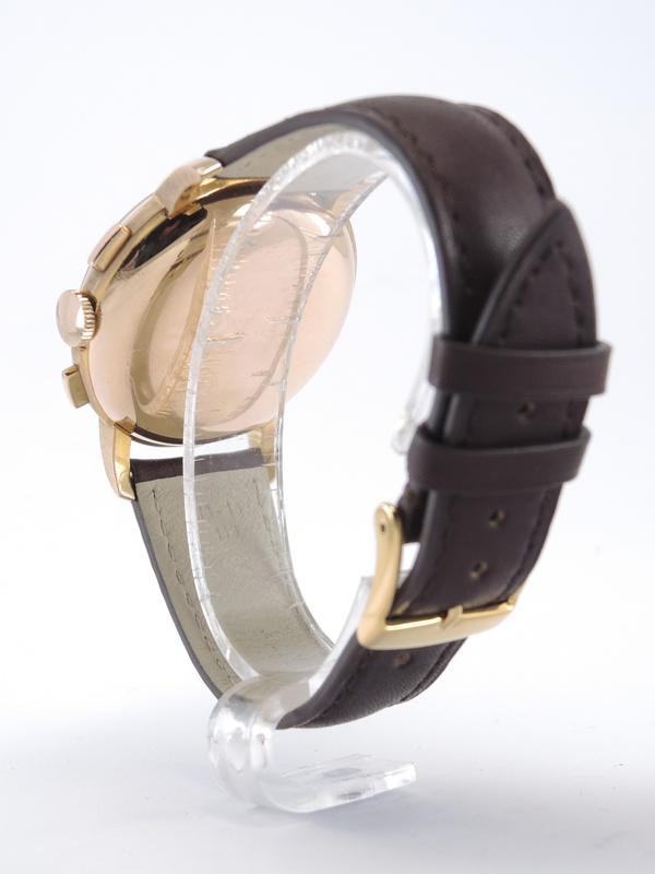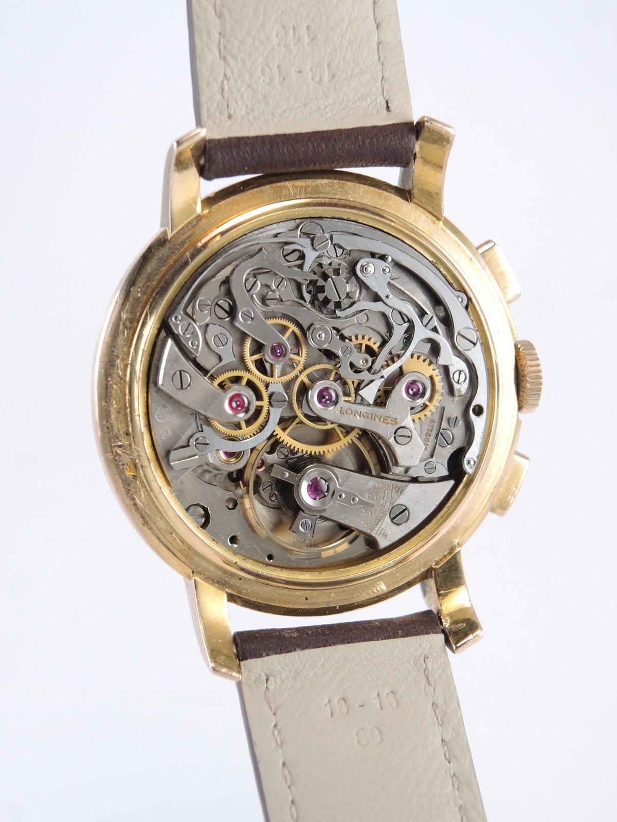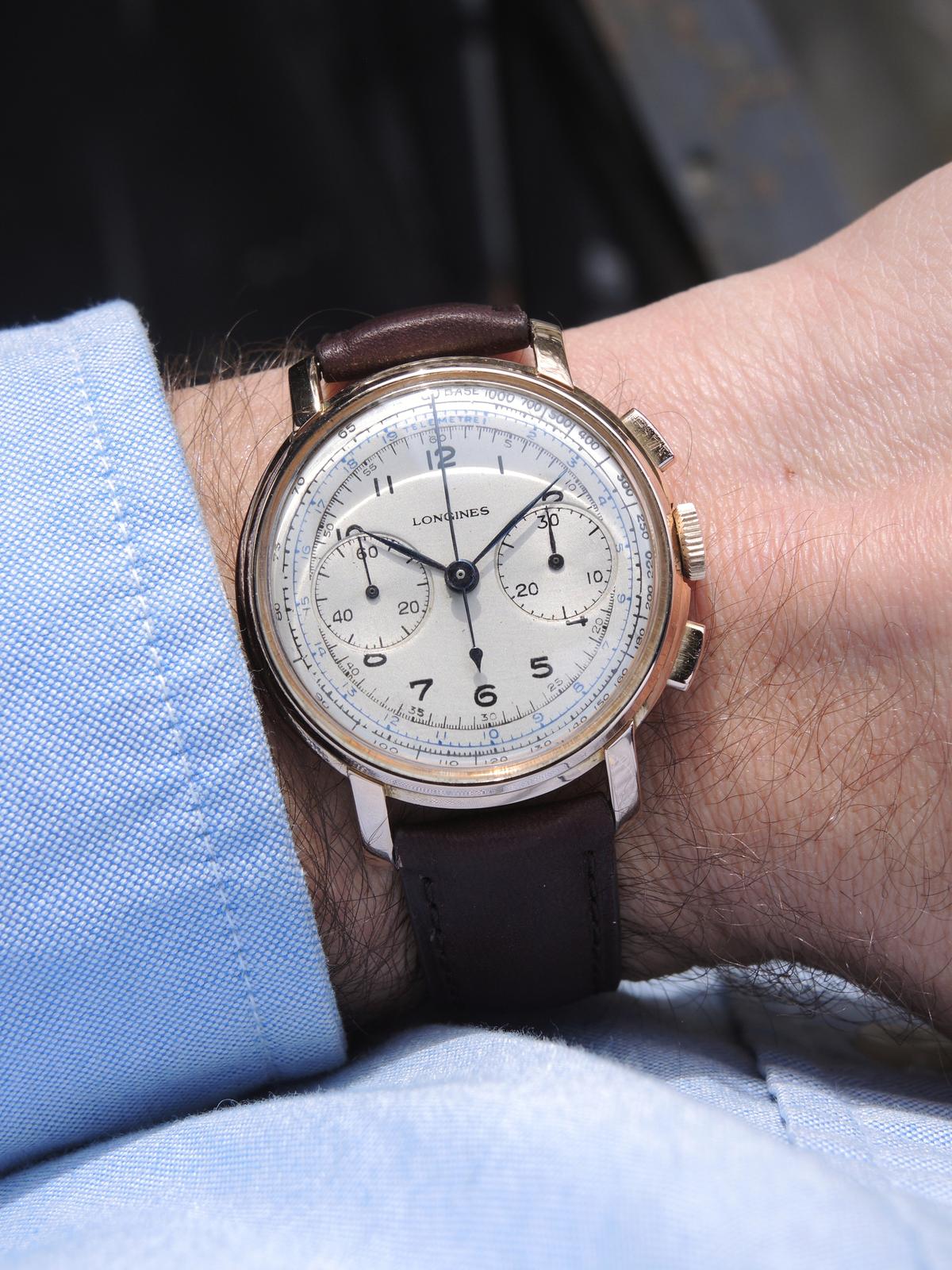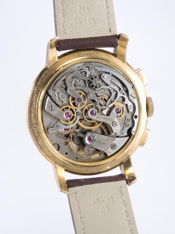 Chronographe 13 ZN - Rose gold case on a leather strap, pin buckle, restored silver dial with arabic numeral markers, chronograph with two subdials, tachymeter and telemeter scales, plexiglass, hand wound movement, caliber 13ZN. The Longines 13ZN is regarded as one of the most technically advanced and aesthetically refined chronograph movements ever produced, even by modern standards.