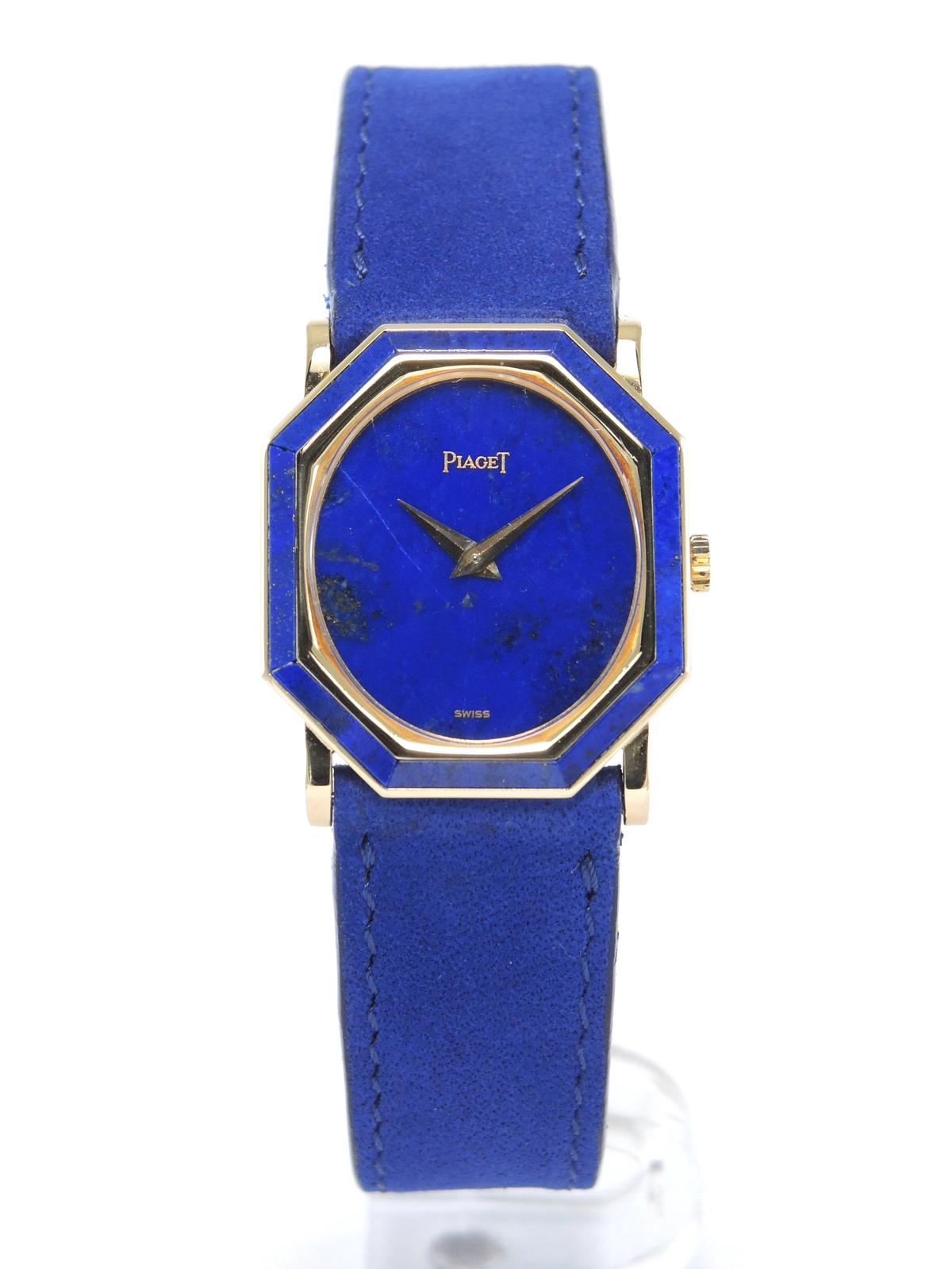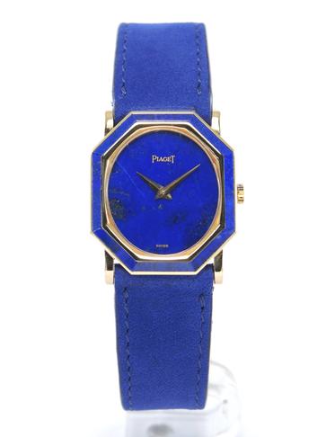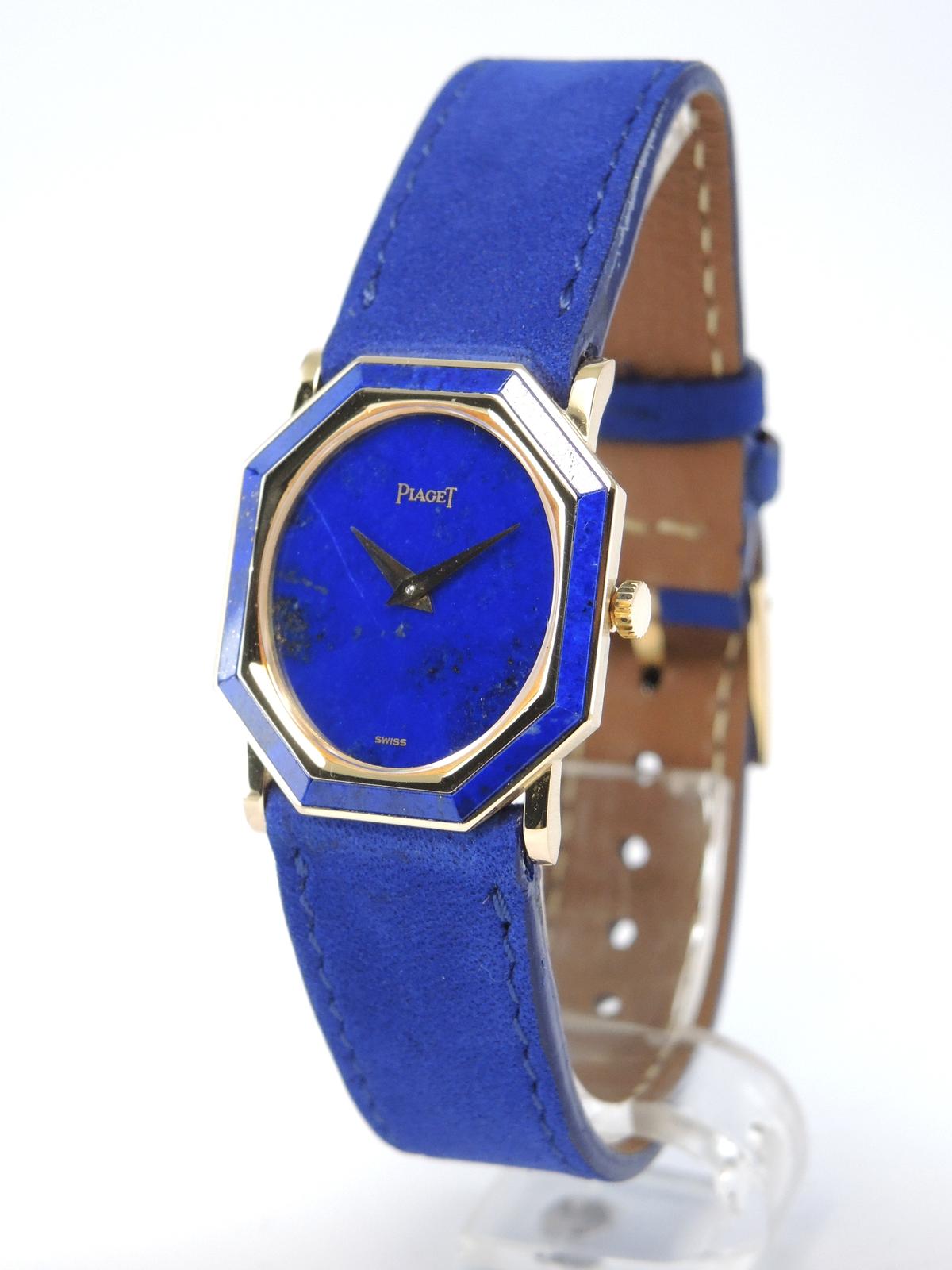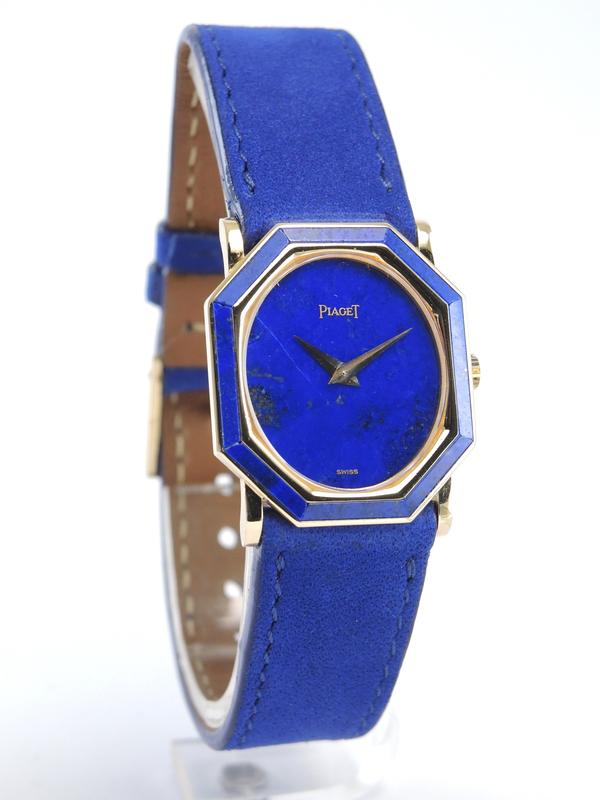 Octagonal Lapis Lazuli 9341 - Yellow gold case with Lapis Lazuli inserts, 24 x 26 mm, leather strap, original pin buckle, blue Lapis Lazuli dial, golden dauphine hands, mineral glass, hand wound movement.