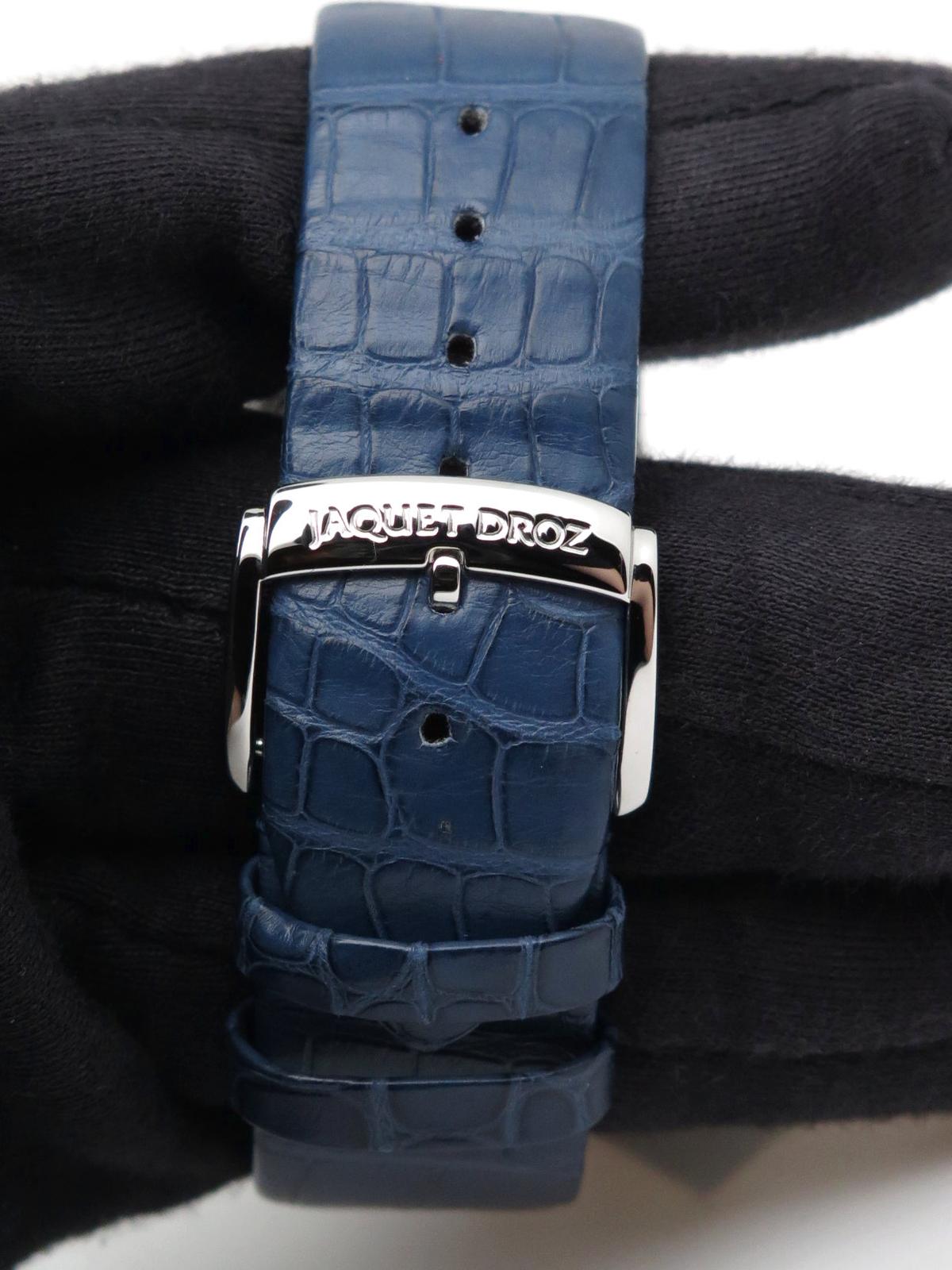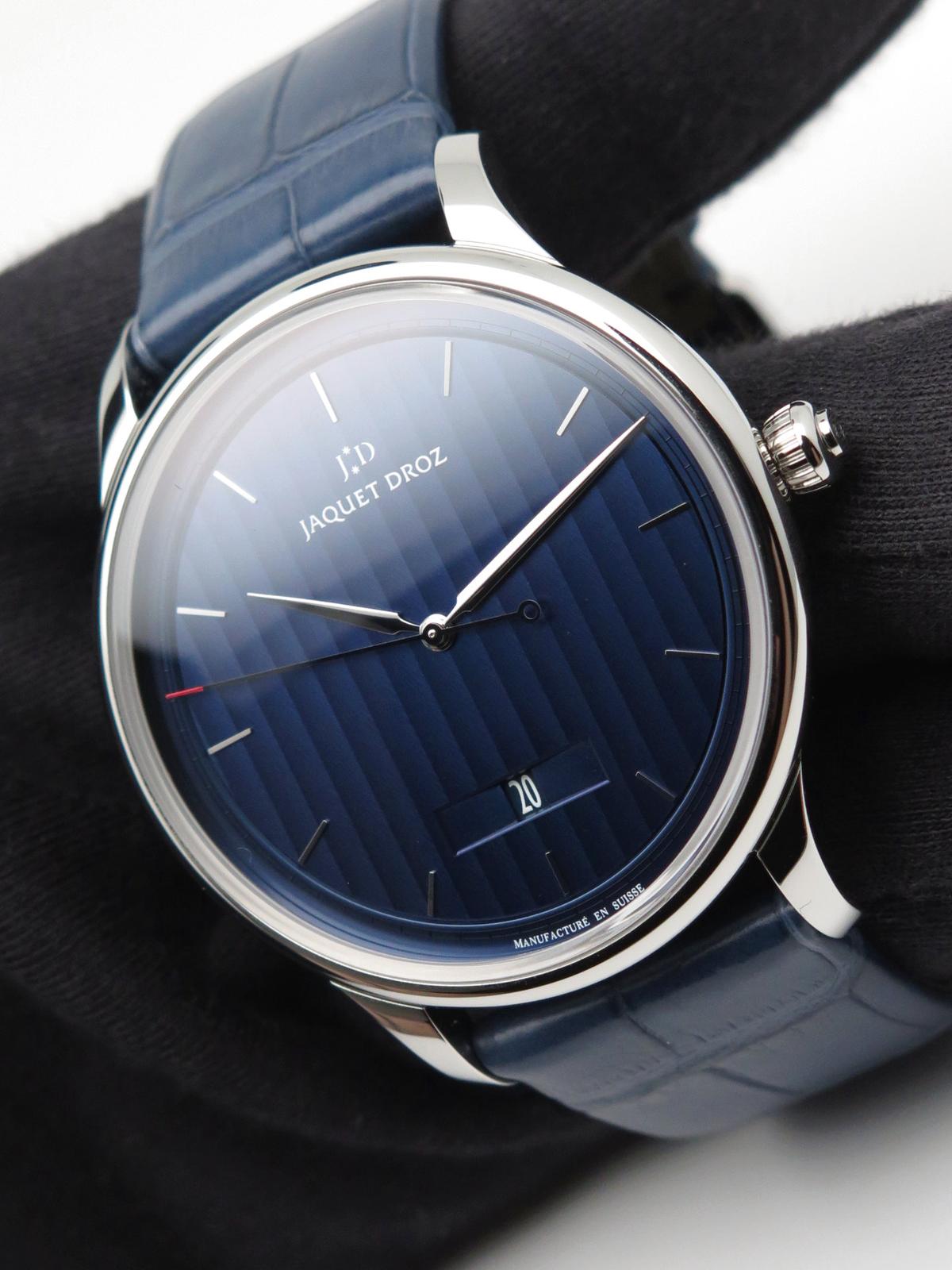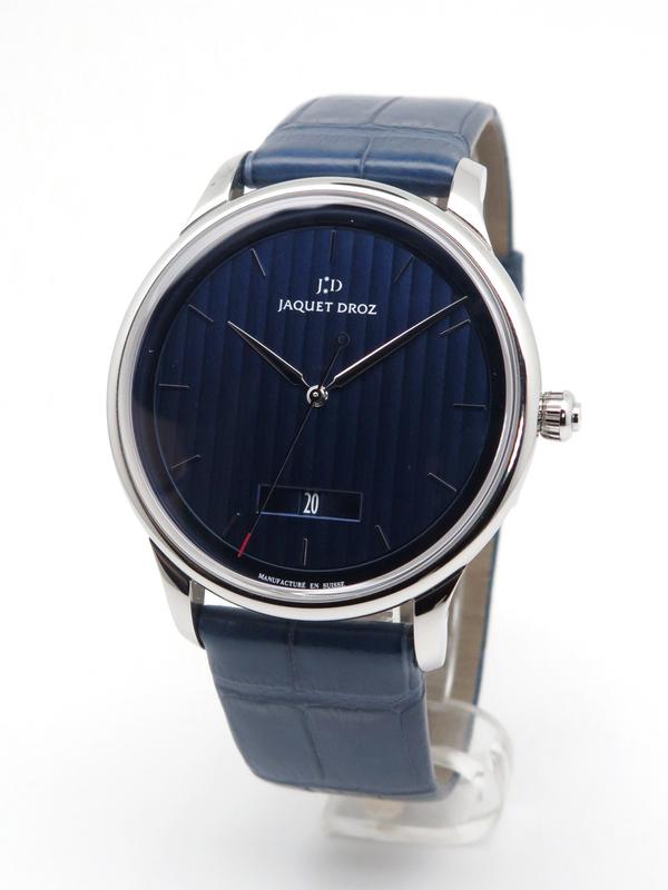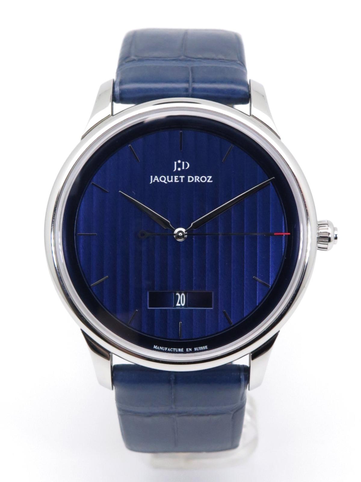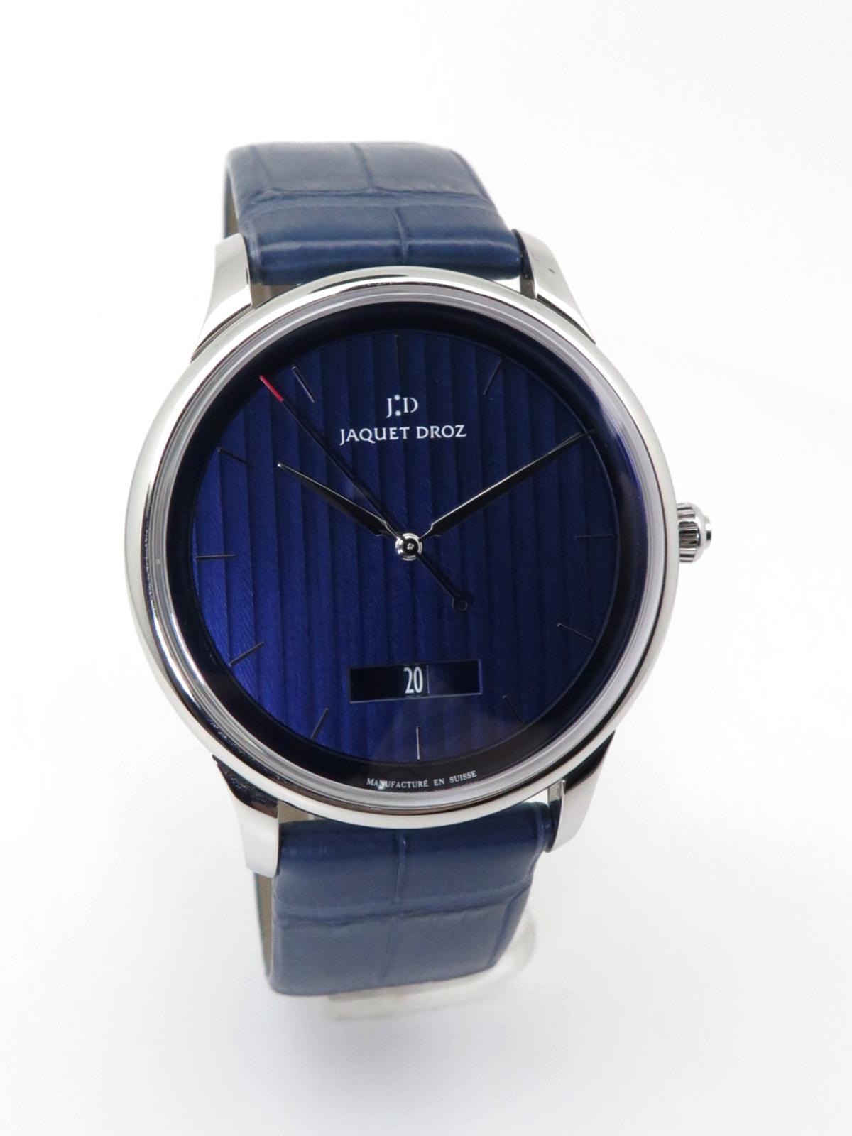 Grande Heure Minute Quantieme full set UNWORN - Ref J017530241 Steel case on blue gray crocodile strap with JD steel pin buckle, blue dial decorated with a linear "Côtes de Genève" pattern, date at 6 o'clock, sapphire crystal and caseback, automatic Jaquet Droz 1150P caliber movement, silicon balance wheel and heavy metal oscillating weight. 28,800 vibrations per hour and power reserve of approximately 68 hours. Delivered with box and papers (blank), new condition
