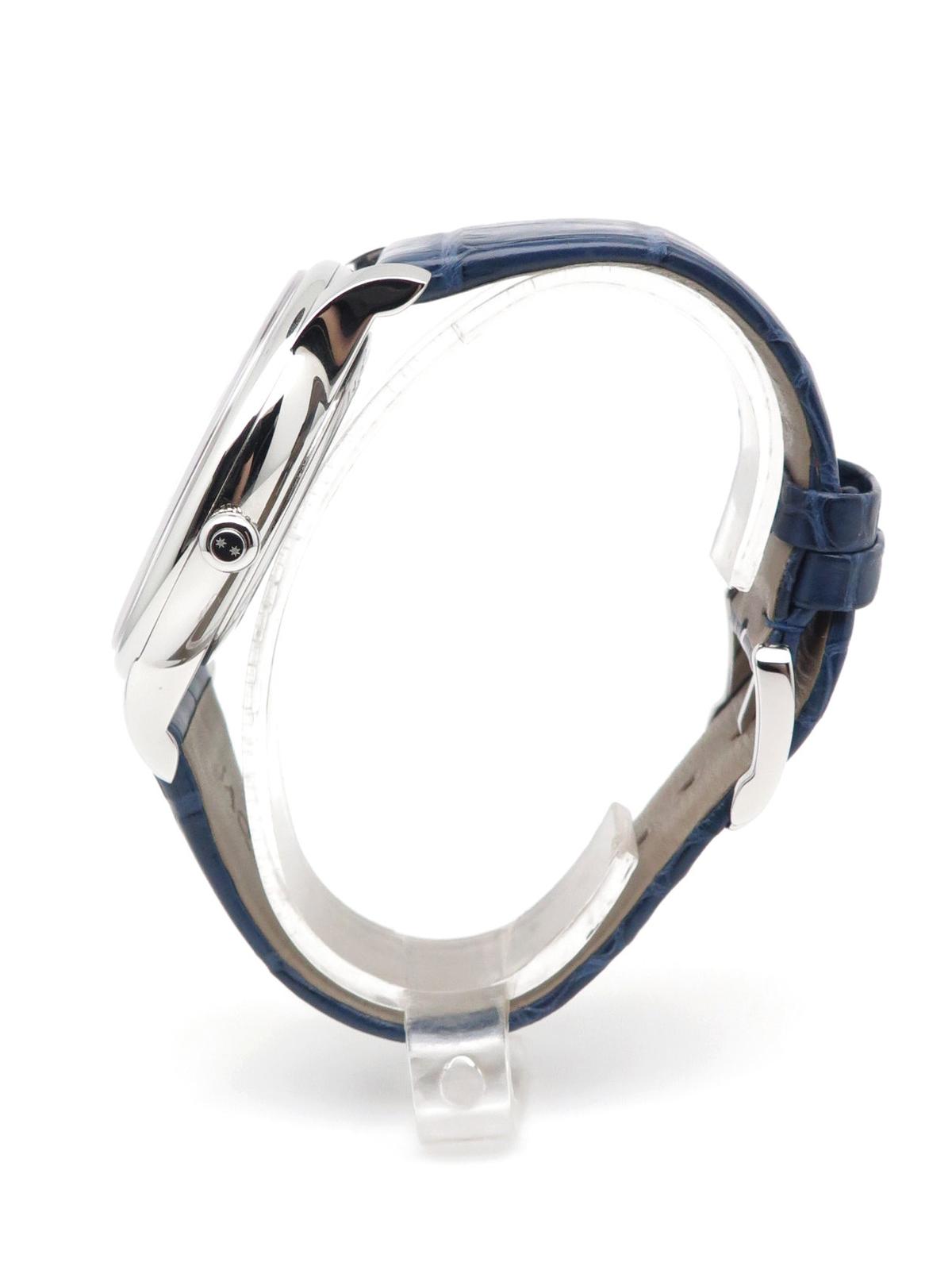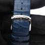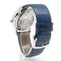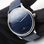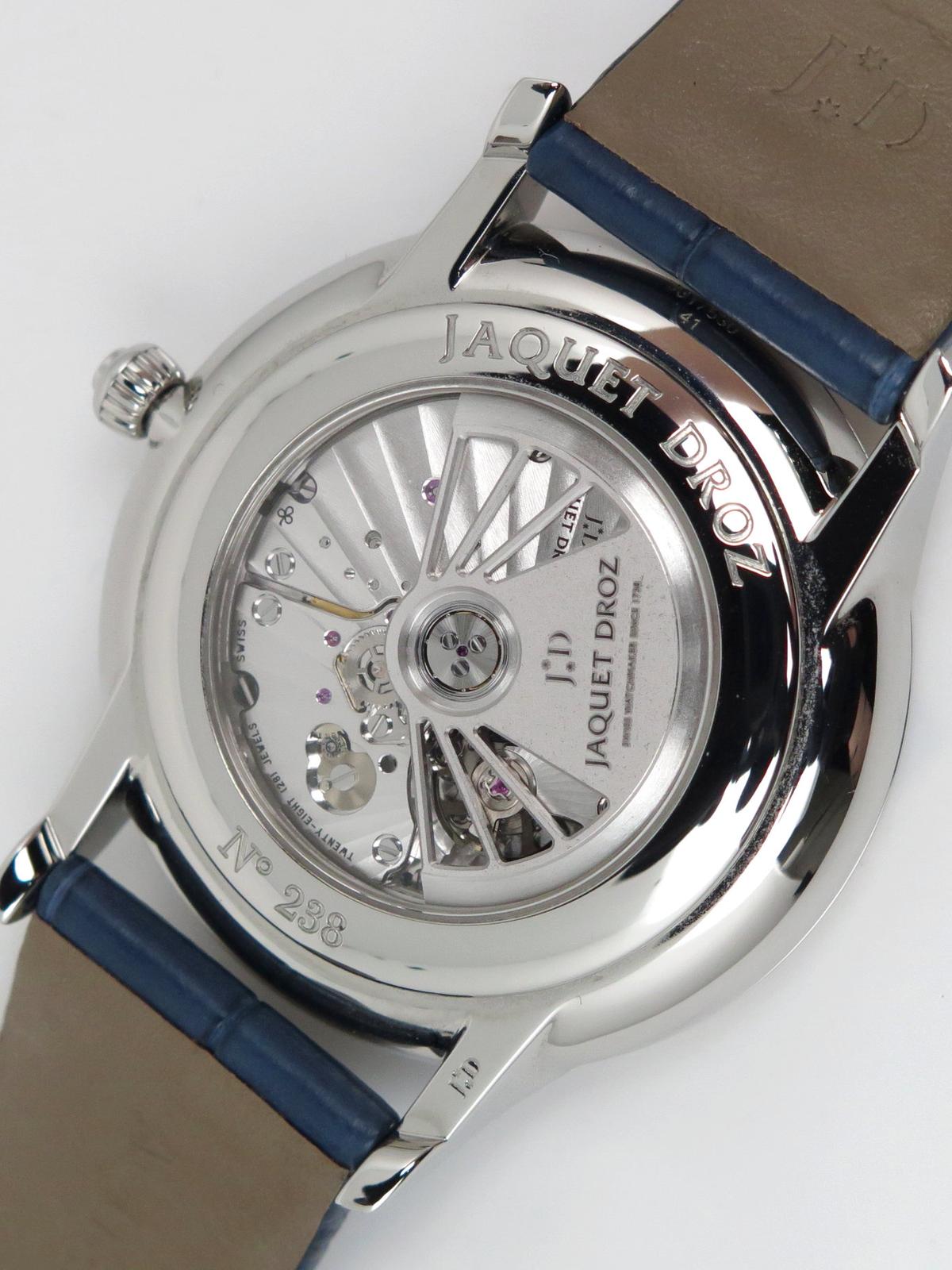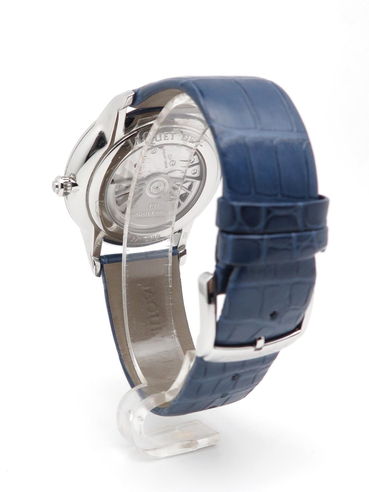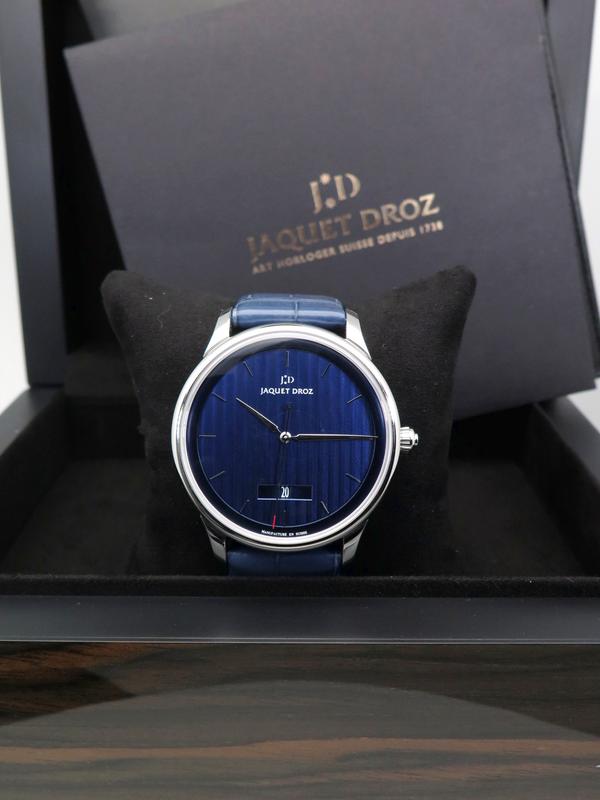 Grande Heure Minute Quantieme full set UNWORN - Ref J017530241 Steel case on blue gray crocodile strap with JD steel pin buckle, blue dial decorated with a linear "Côtes de Genève" pattern, date at 6 o'clock, sapphire crystal and caseback, automatic Jaquet Droz 1150P caliber movement, silicon balance wheel and heavy metal oscillating weight. 28,800 vibrations per hour and power reserve of approximately 68 hours. Delivered with box and papers (blank), new condition